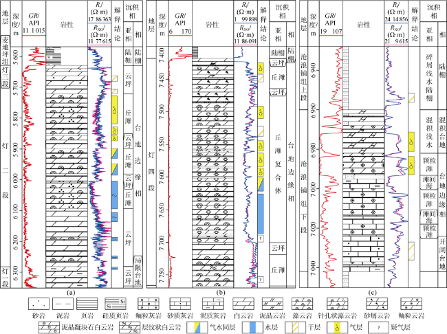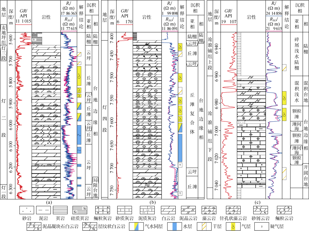 [16],说明其与磨溪地区灯四段气藏相对独立,同时说明川中古隆起北斜坡灯影组台缘带丘滩体能规模成藏。该井沧浪铺组测井解释气层14.5 m/2层,平均孔隙度为4.1%,测试获气超过50×10