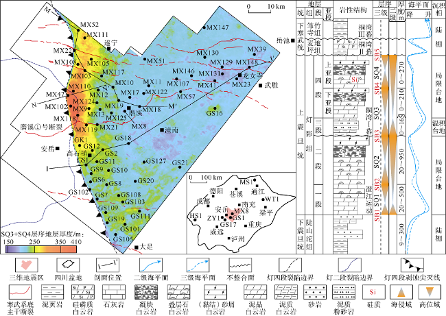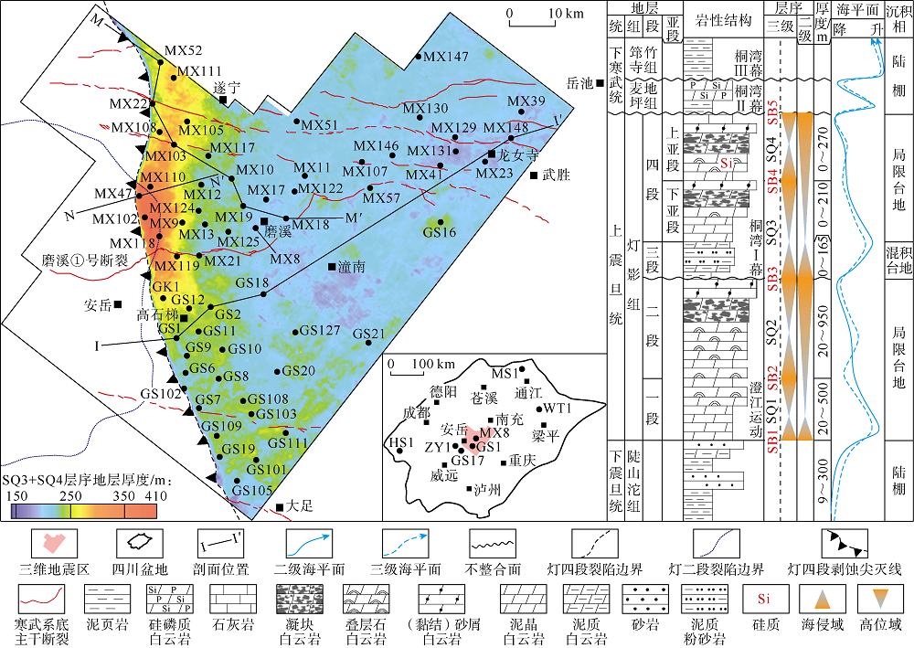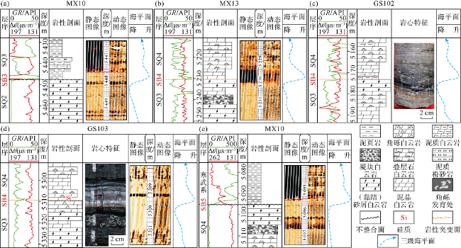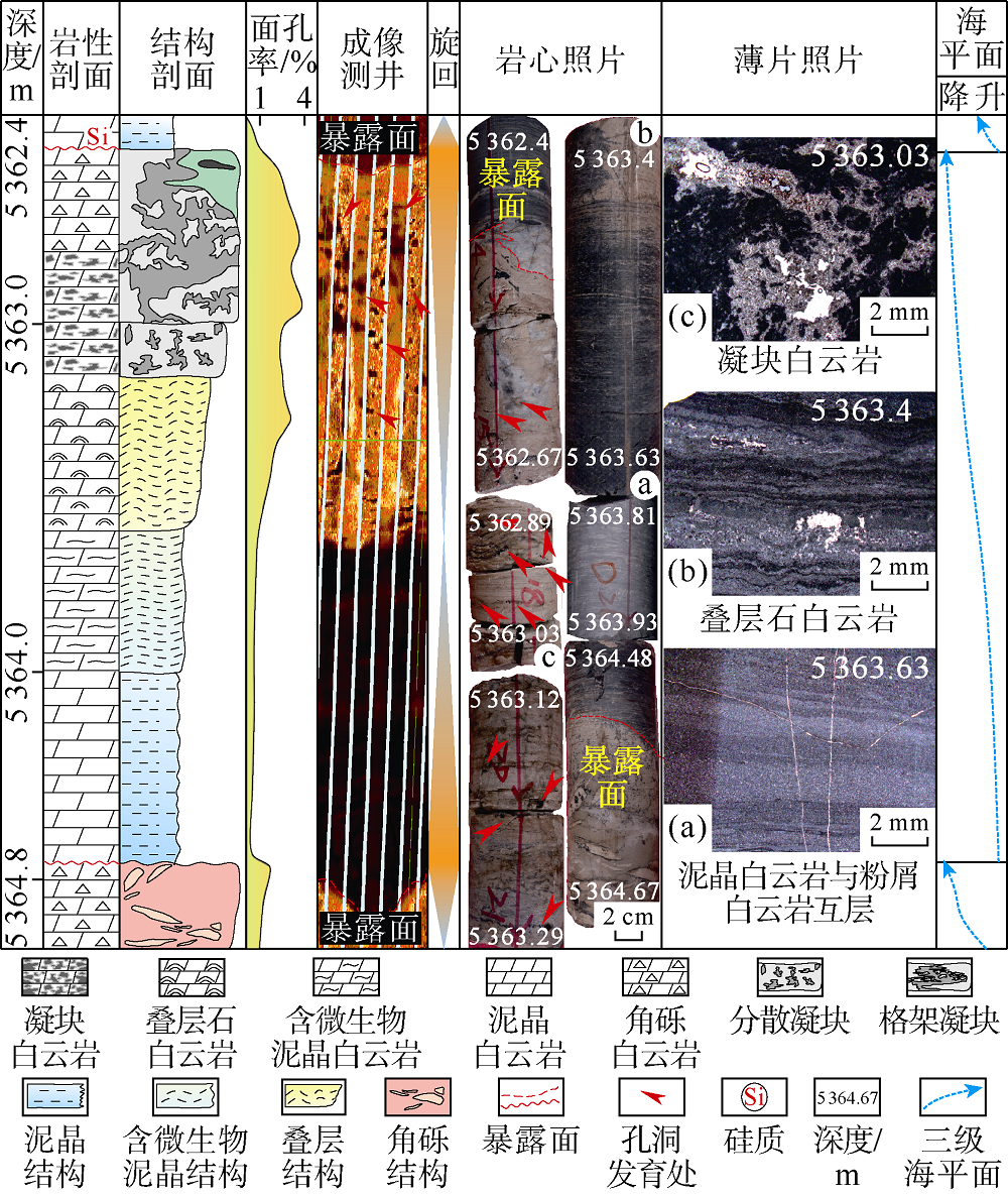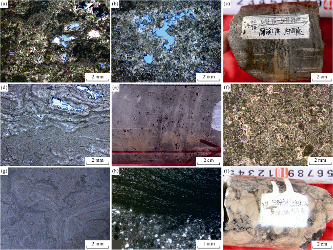 图2 灯影组SQ3和SQ4层序宏微观沉积特征及储集层特征(a)格架白云岩,微生物丘,格架溶蚀孔,灯四段,MX51井,5 341.20 m,蓝色铸体薄片,单偏光;(b)凝块白云岩,微生物丘,溶蚀孔,灯四段,MX21井,5 045.10 m,蓝色铸体薄片,单偏光;(c)凝块白云岩,微生物丘,凝块间孔隙发育,MX17井,5 076.75~5 076.86 m,岩心;(d)叠层石白云岩,微生物丘,残余顺层溶蚀孔洞,MX125 井,灯四段,5 378.40 m,蓝色铸体薄片,单偏光;(e)叠层石白云岩,微生物丘,顺层孔隙发育,MX105井,5 318.50~5 318.60 m,岩心;(f)(黏结)砂屑白云岩,颗粒滩,粒间孔、扩溶缝发育,缝内充填沥青,MX108 井,5 332.11 m,单偏光;(g)泥晶白云岩,丘(滩)间海,MX125井,5 380.92 m,单偏光;(h)纹层状含砂泥晶白云岩,混积台地,5 380.00 m,灯三段,GK1井,正交光,资料据文献[29];(i)近原地角砾白云岩,见少量角砾间残余孔隙,灯四段,MX125 井,5 384.34~5 384.43 m,岩心 |