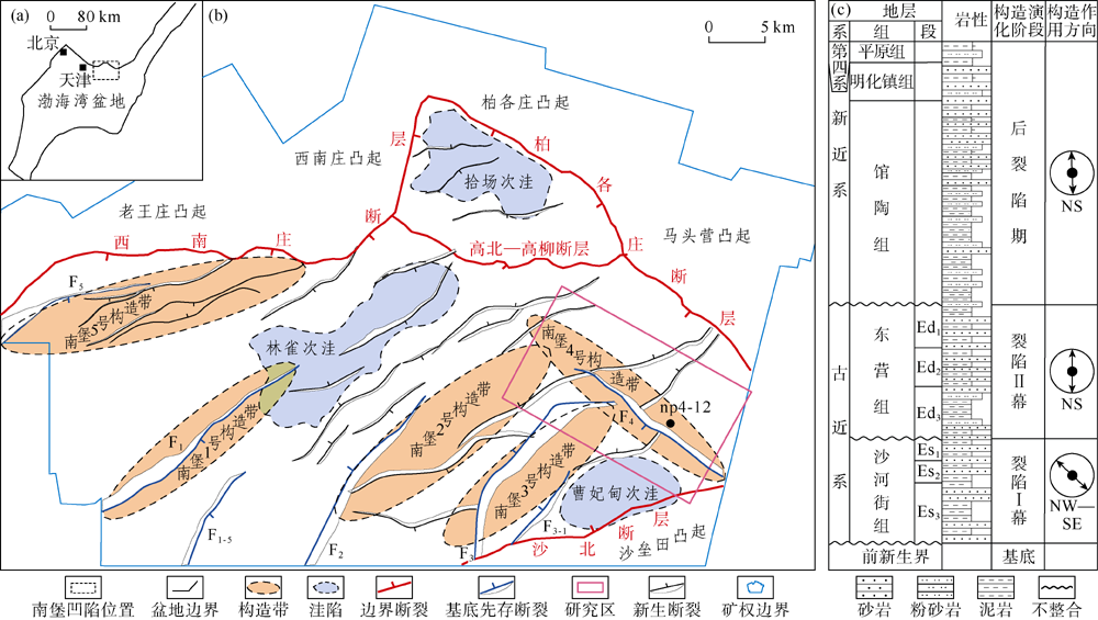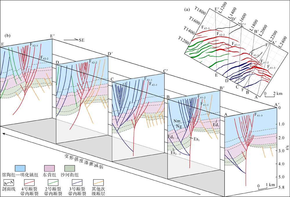 基于地震、钻井等资料,对南堡凹陷基底先存F4号走滑断裂(简称F4号断裂)活化成因机制及其对油气成藏的控制作用进行研究。综合运用断裂活动期次的厘定、断距回剥和物理模拟等技术手段,明确了F4号断裂在新生代再活动形成的南堡凹陷4号构造带由南向北传播生长,南部以走滑变形为主,北部以伸展变形为主;4号构造带与相邻2号、3号构造带内断裂属于不同断裂体系,是在统一应力场作用下通过“独立生长—相互接触—作用连接”最终交织在一起。通过构建先存断裂再活动变形机制判别图版,认为古近系沙河街组沉积期F4号断裂受走滑作用控制发生再活动,古近系东营组和新近系馆陶组—明化镇组沉积期该断裂受斜向伸展作用控制发生再活动。F4号断裂在新生代再活动对成藏的控制作用包括:①作为油源断裂控制油气垂向跨层运移。②形成走滑转换带控制砂体展布。③向上传播生长并与邻区相互作用控制两类圈闭的形成,有利于油气富集。