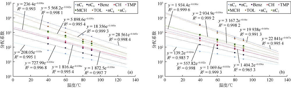 | nC6 | K=727.99 e-0.036T | 0.997 5 | K=557.82 e-0.032T | 0.998 5 |