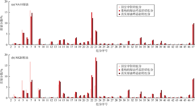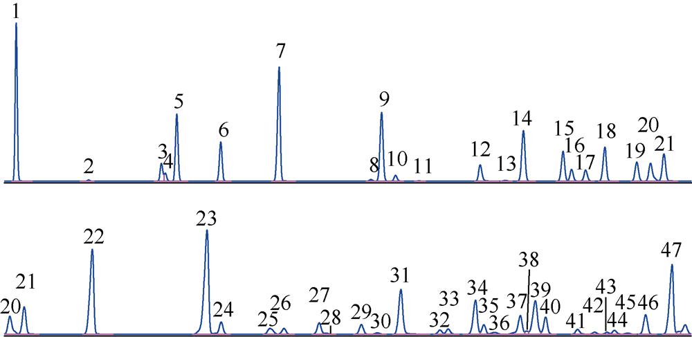 图4 COL1原油样品中nC5—nC8组分的气相色谱1—正戊烷;2—2,2-二甲基丁烷;3—环戊烷;4—2,3-二甲基丁烷;5—2-甲基戊烷;6—3-甲基戊烷;7—正己烷;8—2,2-二甲基戊烷;9—甲基环戊烷;10—2,4-二甲基戊烷;11—2,2,3-三甲基丁烷;12—苯;13—3,3-二甲基戊烷;14—环己烷;15—2-甲基己烷;16—2,3-二甲基戊烷;17—1,1-二甲基环戊烷;18—3-甲基己烷;19—顺式-1,3-二甲基环戊烷;20—反式-1,3-二甲基环戊烷;21—反式-1,2-二甲基环戊烷;22—正庚烷;23—甲基环己烷;24—2,2-二甲基己烷;25—乙基环戊烷;26—2,5-二甲基己烷+2,2,3-三甲基戊烷;27—顺式-1,反式-2,顺式-4-三甲基环丁烷;28—3,3-二甲基己烷;29—顺式-1,反式-2,顺式-3-三甲基环丁烷;30—2,3,4-三甲基戊烷;31—甲苯;32—1,1,2-三甲基环丁烷;33—2,3-甲基-乙基戊烷+2,3-二甲基己烷;34—2-甲基庚烷;35—4-甲基庚烷+3,3-甲基乙基戊烷+3,4-二甲基己烷;36—顺式-1,顺式-2,反式-4-三甲基环丁烷;37—顺式-1,3-二甲基环己烷;38—顺式-1,顺式-2,反式-3-三甲基环丁烷+3-甲基庚烷;39—3-乙基己烷;40—反式-1,4-二甲基环己烷;41—1,1-二甲基环己烷;42—反式-1,3-乙基-甲基环戊烷+2,2,5-三甲基己烷;43—顺式-1,3-乙基-甲基环戊烷;44—反式-1,2-乙基-甲基环戊烷;45—1,1-乙基-甲基环戊烷+2,2,4-三甲基己烷;46—反式-1,2-二甲基环己烷;47—正辛烷 |