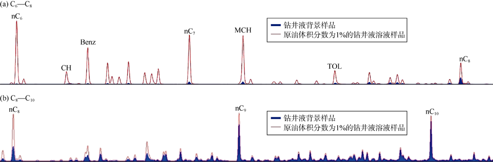 | 组分 | 钻井液背景样品静态 顶空中某组分的峰面积 | 钻井液溶液样品静态 顶空中某组分的峰面积 | 两个峰面积 重叠率/% |