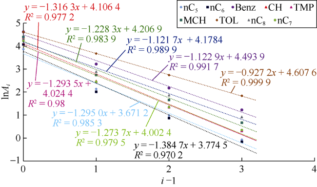 注:P5,P6,P7,P8—碳数为5,6,7,8的正构烷烃;I6,I7,I8—碳数为6,7,8的异构烷烃;N5,N6,N7,N8—碳数为5,6,7,8的环烷烃;A6,A7—碳数为6,7的芳香烃 |