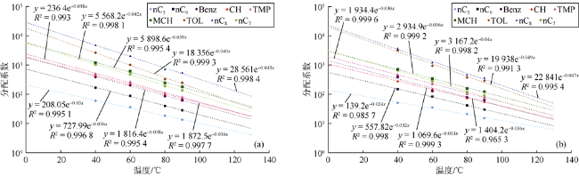 | nC7 | K=5 568.2 e-0.042T | 0.997 4 | K=3 167.2 e-0.040T | 0.995 5 |
