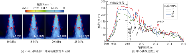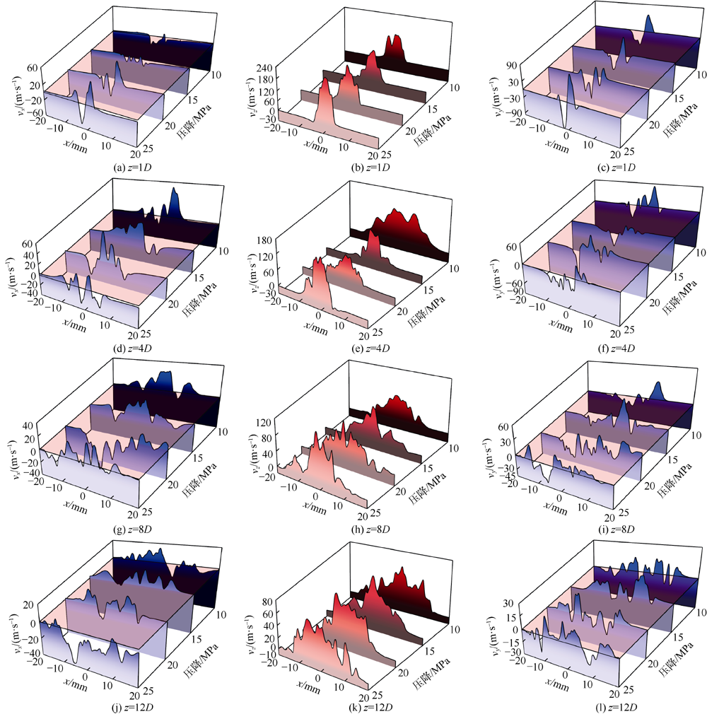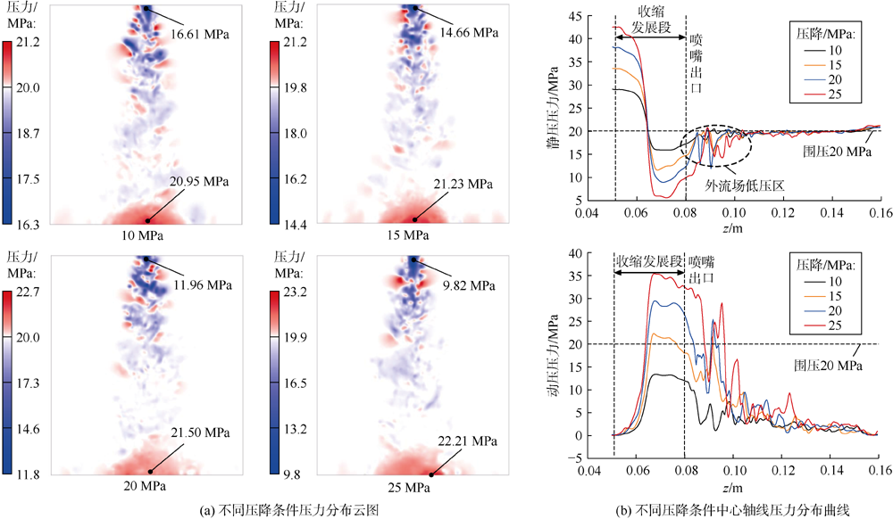 The improved delayed detached eddy simulation method with shear stress transport model was used to analyze the evolution of vortex structure, velocity and pressure of swirling jet. The influence of nozzle pressure drop on vortex structure development and turbulence pulsation was investigated. The development of vortex structure could be divided into three stages: Kelvin-Helmholtz (K-H) instability, transition stage and swirling flow instability. Swirling flow could significantly enhance radial turbulence pulsation and increase diffusion angle. At the downstream of the jet flow, turbulence pulsation dissipation was the main reason for jet velocity attenuation. With the increase of pressure drop, the jet velocity, pulsation amplitude and the symmetry of velocity distribution increased correspondingly. Meanwhile the pressure pulsation along with the axis and vortex transport intensity also increased significantly. When the jet distance exceeded about 9 times the dimensionless jet distance, the impact distance of swirling jet could not be improved effectively by increasing the pressure drop. However, it could effectively increase the swirl intensity and jet diffusion angle. The swirling jet is more suitable for radial horizontal drilling with large hole size, coalbed methane horizontal well cavity completion and roadway drilling and pressure relief, etc.