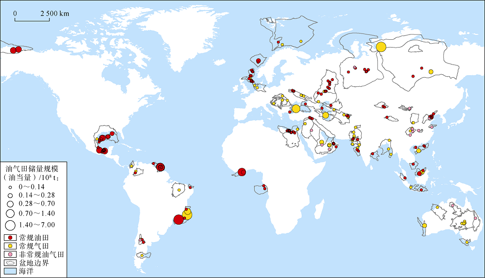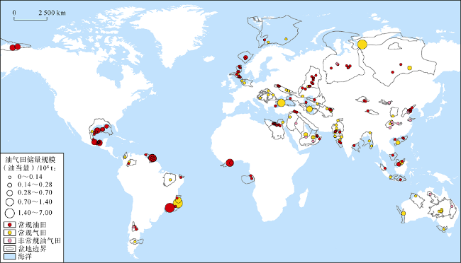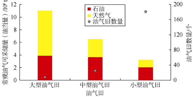 图2 2021年不同规模的常规油气田储量/数量柱状图大型、中型和小型油气田的可采储量当量分别为大于5×108 bbl(1 bbl=0.137 t)、(1~5)×108 bbl、小于1×108 bbl |