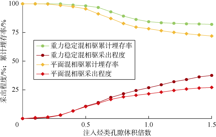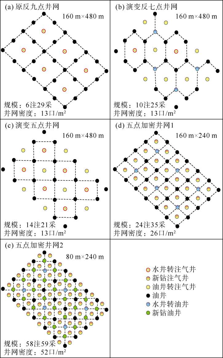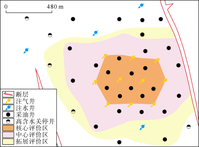 | 全面突破、高气油比阶段(Ⅳ) | >0.65 | 生产井全面突破,大量生产井气窜,高气油比生产,气油比大于500 m3/t,产液量、产油量逐渐下降 |