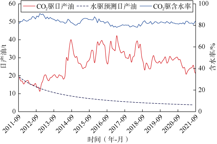 | 全面见效、产量平稳阶段(Ⅲ) | 0.30~ 0.65 | 生产井全面见到CO2驱油的混相油墙带,含水率大幅下降,产液量、产油量上升到平稳高峰期,气油比稳定上升到500 m3/t |