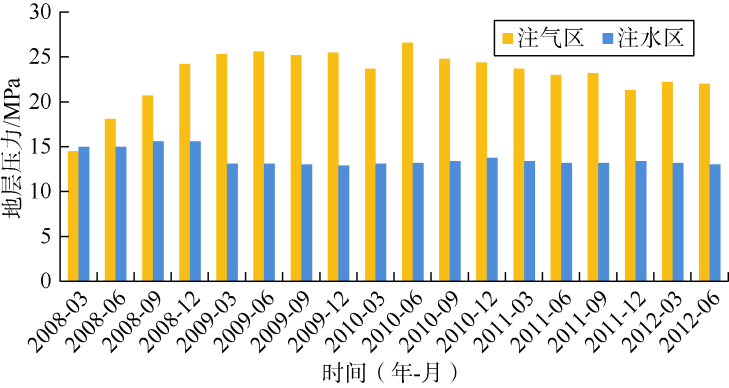 | 延续水驱、能量恢复阶段(Ⅰ) | 0~0.05 | 地层压力上升,生产延续水驱特征。转气驱时低含水井产液量、产油量大幅上升,含水率降低;转气驱时中高含水井产液量上升、产油量无明显变化,含水率上升,局部见气,气油比小于50 m3/t |