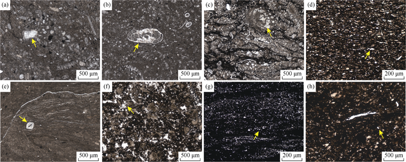 图3 林滩场地区LY3井龙潭组页岩不同岩相页岩沉积结构镜下微观特征(a)3 162.38 m,贫有机质钙质页岩,可见生物碎屑结构,单偏光;(b)3 162.38 m,贫有机质钙质页岩,可见生物碎屑结构,生物碎屑被白云石交代,单偏光;(c)3 157.80 m,贫有机质混合页岩,可见生物碎屑结构,单偏光;(d)3 221.19 m,贫有机质混合页岩,可见泥质结构,含硅质碎屑,单偏光;(e)3 167.37 m,贫有机质黏土页岩,可见泥质结构,含钙质碎屑,单偏光;(f)3 175.20 m,贫有机质黏土页岩,可见泥质结构,含硅质碎屑,单偏光;(g)3 178.01 m,富有机质黏土页岩,可见泥质结构,含硅质碎屑,单偏光;(h)3 213.77 m,富有机质黏土页岩,可见泥质结构,含硅质碎屑,单偏光 |