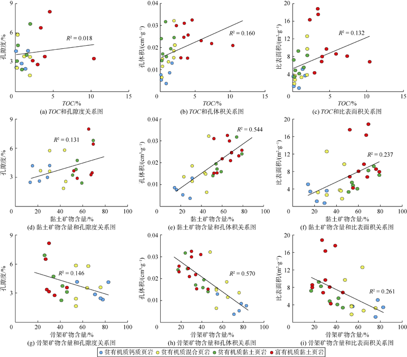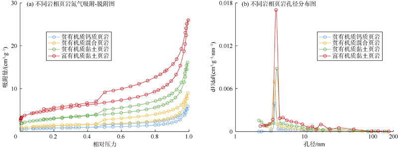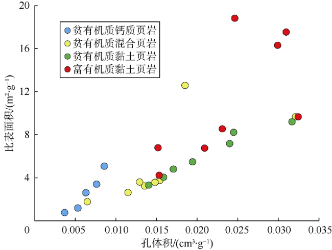 | 页岩 类型 | TOC/% | 孔隙度/% | 优势 孔隙类型 | 孔体积/ (cm3·g−1) | 不同孔径对孔 体积的贡献 | 比表面积/ (m2·g−1) | 不同孔径对比表面积的贡献 |
