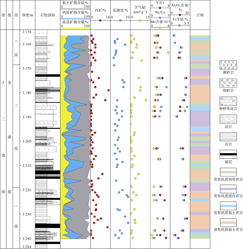 | 海陆 过渡相 | 氧化环境(Mo含量 平均值为2.3×10−6) | 高 (Al2O3含量平均值为21.2%) | 较高 (Cu含量平均值为197.0×10−6) | 陆源碎屑输入量高,虽然氧化的条件 下有机质保存条件差,但较高的古 生产力使得有机质仍然可以聚集 | 1.32~11.69 4.77 | ||