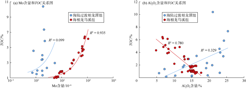 | 海相 | 无氧环境(Mo含量 平均值为65.1×10−6) | 低 (Al2O3含量平均值为6.5%) | 较低 (Cu含量平均值为75.8×10−6) | 陆源碎屑输入量低,无氧环境下有机 质良好的保存条件和古生产力的匹配 | 10.07~21.85 17.68 | ||