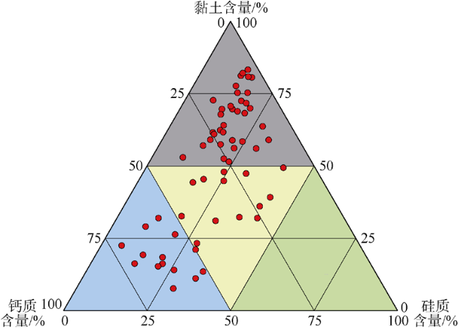 | 贫有机质混合页岩 | 23.0~48.0 37.7 | 9.0~48.0 29.8 | 16.0~42.0 29.4 | 0.16~1.97 0.92 | 1.66~5.86 3.79 | 部分具有生物碎屑结构 部分以泥质结构为主 |