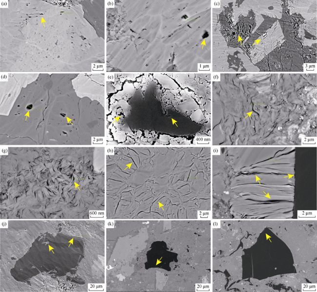 图4 林滩场地区LY3井龙潭组海陆过渡相页岩扫描电镜图(a)3 197.35 m,贫有机质钙质页岩,菱铁矿发育粒内溶蚀孔,骨架矿物相关孔;(b)3 208.26 m,贫有机质混合页岩,菱铁矿发育粒内溶蚀孔,骨架矿物相关孔;(c)LY3井,3 206.05 m,富有机质黏土页岩,菱铁矿发育微裂缝、溶蚀孔,片状伊蒙混层发育层间缝,骨架矿物相关孔和黏土矿物相关孔;(d)3 201.74 m,贫有机质黏土页岩,石英粒内孔隙和微裂缝,骨架矿物相关孔;(e)3 197.35 m,贫有机质钙质页岩,有机质孔不发育,可见颗粒之间粒间孔和微裂缝,骨架矿物相关孔和有机质孔;(f)3 197.35 m,贫有机质钙质页岩,片状伊蒙混层发育层间缝,黏土矿物相关孔;(g)3 208.26 m,贫有机质混合页岩,片状伊蒙混层发育层间缝,黏土矿物相关孔;(h)3 201.74 m,贫有机质黏土页岩,片状伊蒙混层发育层间缝,黏土矿物相关孔;(i)3 229.32 m,富有机质黏土页岩,片状伊利石发育层间缝,同时可见黏土矿物和有机质边缘的收缩缝,黏土矿物相关孔;(j)3 175.20 m,贫有机质黏土页岩,有机质孔发育差,可见少量孔隙和微裂缝,有机质孔;(k)3 222.58 m,贫有机质混合页岩,有机质孔不发育,可见少量微孔,有机质孔;(l)3 229.32 m,富有机质黏土页岩,有机质孔不发育,可见微裂缝在有机质内部发育,有机质孔 |