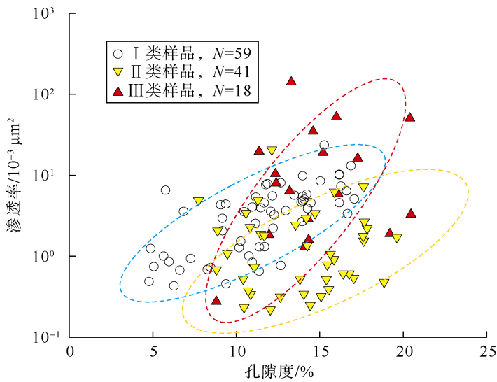 | Ⅱ类,凝灰质强溶蚀, 残余凝灰质强蚀变 | LF-13-A、 LF13-B、LF-15-A | 中性凝灰质、 碱性凝灰质 | 2.62 | 13.85 | 2.69 | 凝灰质溶孔、部分原生孔、 黏土晶间微孔、磷灰石晶间孔 |