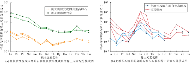 图6 研究区文昌组凝灰质蚀变产物的微观特征(a)HZ-25-A井,3 527.30 m,文五段,酸性凝灰质蚀变为自生高岭石,单偏光;(b)图a方框处扫描电镜特征,自生高岭石晶形差,凝灰质充填晶间孔,扫描电镜;(c)HZ-26-A井,3 415.20 m,文四段,基性凝灰质绿泥石化,局部发生伊利石化,见自生石英沉淀,扫描电镜;(d)HZ-25-B井,3 777.13 m,文六段,酸性凝灰质沿颗粒边缘及微裂缝蚀变为伊利石,正交光;(e)LF-15-A井,3 710.90 m,文四段,中性凝灰质发生伊利石化,扫描电镜;(f)LF-15-A井,3 645.40 m,文四段,自生高岭石发生伊利石化,扫描电镜;(g)LF-13-B井,3 484.00 m,文三段,中性凝灰质发生溶蚀,自生石英充填溶孔,单偏光;(h)LF-13-A井,3 455.00 m,文三段,自生石英颗粒充填凝灰质溶孔,单偏光;(i)HZ-26-B井,3 791.00 m,文四段;(j)HZ-26-B井,3 816.50 m,文四段,浊沸石充填基性凝灰质溶孔,具有凝灰质溶蚀残余,单偏光;(k)HZ-26-B井,3 798.00 m,文四段,浊沸石粒内溶孔发育,单偏光;(l)LF-13-A井,3 413.00 m,文三段,碱性凝灰质蚀变为磷灰石,呈球粒状沿颗粒边缘或溶孔发育,单偏光;(m)LF-13-A井,3 413.00 m,文三段,早期磷灰石阴极发光下呈黄褐色,晚期磷灰石阴极发光下呈荧光绿色,阴极发光;(n)LF-13-A井,3 413.00 m,文三段,球粒状磷灰石集合体,扫描电镜;(o)LF-13-A井,3 430.60 m,文三段,粒间针棒状磷灰石充填溶孔,晶间孔中充填黄铁矿,单偏光;(p)LF-13-A井,3 451.50 m,文三段,短柱状磷灰石内部呈橘红色,边缘呈荧光绿色的阴极发光,阴极发光 |