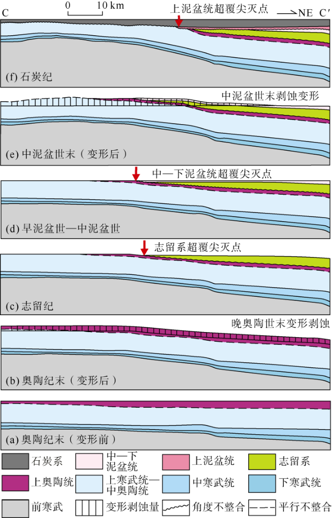 Based on well horizon calibration, the typical seismic profiles in southwestern Tarim Basin were interpreted systematically, regional geological sections were established, and the regional denudation thickness of each tectonic period was restored. On this basis, the plane morphology maps of ancient structures of the Cambrian pre-salt dolomites in different periods were compiled, and the spatial distribution, development, evolution and migration of paleo-uplift in the late Early Paleozoic were analyzed. In the late Early Paleozoic, there existed a unified regional paleo-uplift widely distributed in southwestern Tarim Basin, which is called the southwestern Tarim plaeo-uplift. The “Tarim SW paleo-uplift” and “Hotan paleo-uplift” proposed in previous literatures are not independent, but the result of the spatio-temporal migration and evolution of the southwestern Tarim paleo-uplift identified in this paper. The southwestern Tarim paleo-uplift emerged at the end of Middle Ordovician, and took its initial shape with increased amplitude in the Late Ordovician. During the Silurian, the southwestern Tarim paleo-uplift rose steadily and expanded rapidly to the east, incorporating Pishan-Hotan and other areas, with the structural high locating in the Pishan-Hotan area. During the Devonian, the southwestern Tarim paleo-uplift began to shrink gradually, to a limited range in the Pishan-Hotan area in the southern part of the basin. During the Carboniferous, the southwestern Tarim paleo-uplift became an underwater uplift, that is, the paleo-uplift gradually died out. The southwestern Tarim paleo-uplift belongs to the forebulge of the southwestern Tarim foreland basin in the late Early Paleozoic, and its formation and evolution are related to the early Paleozoic orogeny of the West Kunlun orogenic belt in the south of the Tarim Basin. The migration of the southwestern Tarim paleo-uplift from the northwestern part of the southwestern Tarim Basin to the Pishan-Hotan area indicates the early Paleozoic orogenic process of the West Kunlun orogenic belt, which started in the western section at the end of Middle Ordovician and extended from west to east in a “scissor” style. The migration and evolution of the southwestern Tarim paleo-uplift controlled the development of unconformities at the end of Middle Ordovician, the end of Late Ordovician, and the end of Middle Devonian, and the spatial distribution of dissolved fracture-cave reservoirs in weathered crust below the unconformities in the southwest of Tarim Basin. The migration of the structural high of the southwestern Tarim paleo-uplift also played an important role in controlling the development of dissolved fracture-cave reservoirs in weathered crust.