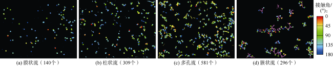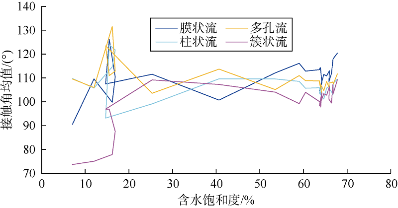 借助数字图像处理技术,以微流控水驱油实验视频为数据源,建立了微流控模型孔喉内三相接触角的自动批量测量计算方法;采用人工测量数据验证了新方法测量结果的可靠性,在此基础上,利用接触角概率密度曲线、均值变化曲线揭示了三相接触角在流动条件下的动态变化规律。研究表明:对于水湿岩石,水驱油过程中,驱替前期接触角均值以锐角为主,随驱替时间的延长,油相受力逐渐由黏滞力为主导向毛细管力为主导过渡,接触角均值不断增大,至驱替中后期以钝角为主。剩余油中的滴状流赋存于孔喉通道中央,不存在三相接触角;多孔流和柱状流在整个驱替过程中接触角变化幅度较小且均值皆为钝角,该类剩余油形成后流动性差,动用难度较大;簇状流在驱替过程中三相接触角均值整体呈上升趋势,剩余油动用难度逐渐升高;膜状流整体呈钝角,水驱后期接触角均值最大,动用难度最大。驱替结束后,不同流态剩余油仅受毛细管力作用的影响,接触角均为钝角,在原油作用下模型孔喉壁润湿性呈油湿特征。