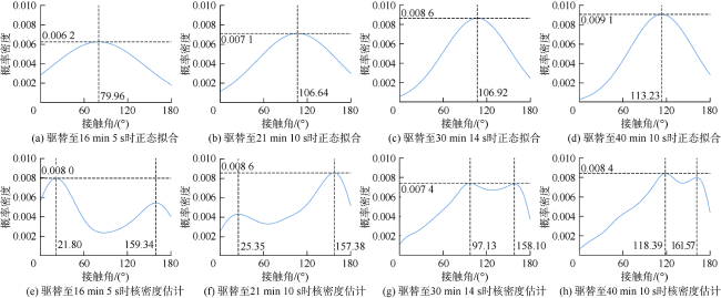 With the help of digital image processing technology, an automatic measurement method for the three-phase contact angles in the pore throats of the microfluidic model was established using the microfluidic water flooding experiment videos as the data source. The results of the new method were verified through comparing with the manual measurement data. On this basis, the dynamic changes of the three-phase contact angles under flow conditions were clarified by the contact angles probability density curve and mean value change curve. The results show that, for water-wetting rocks, the mean value of the contact angles is acute angle during the early stage of the water flooding process, and it increases with the displacement time and becomes obtuse angle in the middle-late stage of displacement as the dominant force of oil phase gradually changes from viscous force to capillary force. The droplet flow in the remaining oil occurs in the central part of the pore throats, without three-phase contact angle. The contact angles for the porous flow and the columnar flow change slightly during the displacement and present as obtuse angles in view of mean values, which makes the remaining oil poorly movable and thus hard to be recovered. The mean value of the contact angle for the cluster flow tends to increase in the flooding process, which makes the remaining oil more difficult to be recovered. The contact angles for the membrane flow are mainly obtuse angles and reach the highest mean value in the late stage of displacement, which makes the remaining oil most difficult to be recovered. After displacement, the remaining oils under different flow regimes are just subjected to capillary force, with obtuse contact angles, and the wettability of the pore throat walls in the microfluidic model tends to be oil-wet under the action of crude oil.