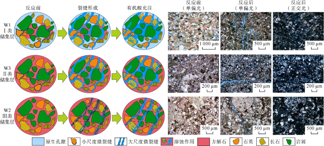 | 成岩微观 特征 | 原生孔隙发育 胶结程度低 微裂缝发育 | 次生孔隙发育 胶结程度高 微裂缝发育 | 孔隙不发育 胶结程度高 微裂缝发育 | 成岩作用- 储集空间 特征 | 原生孔隙发育 胶结程度低 | 胶结程度高 | 胶结程度高 微裂缝发育 | W1可能向Ⅰ类储集层演化 W2可能向Ⅲ类储集层演化 W3可能向Ⅱ类储集层演化 | |