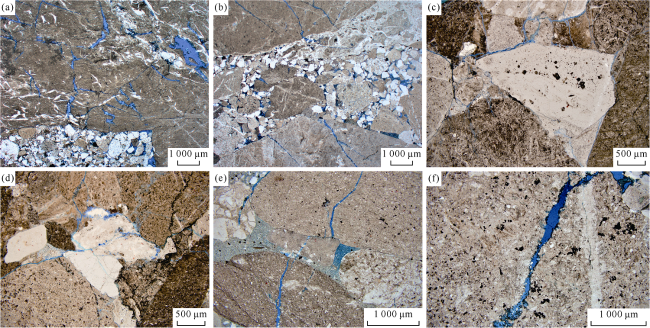 图2 准噶尔盆地南缘西段清水河组碎屑岩储集层微裂缝特征(a)GHW001井,5 829.04 m,凝灰岩颗粒内部呈网状分布的小尺度微裂缝,铸体薄片;(b)GHW001井,5 829.96 m,砾石内部形成的小尺度微裂缝,铸体薄片;(c)G103井,5 905.90 m,环颗粒边缘的小尺度微裂缝,铸体薄片;(d)G103井,5 907.75 m,环颗粒边缘的小尺度微裂缝,铸体薄片;(e)GHW001井,5 829.32 m,大尺度微裂缝,具有切穿多个砾石的特征,呈多组出现,定向性明显,铸体薄片;(f)GHW001井,5 833.96 m,大尺度微裂缝,镜下可见砾石被一分为二,铸体薄片 |
