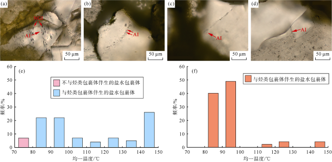 图5 准噶尔盆地南缘西段清水河组碎屑岩储集层流体包裹体特征与均一温度(NGI—天然气包裹体;AI—盐水包裹体)(a)GHW001井,5 820.89 m,石英微裂缝中的天然气包裹体及伴生的盐水包裹体;(b)GHW001井,5 825.36 m,石英次生微裂缝中的盐水包裹体;(c)GHW001井,5 828.19 m,石英加大边中的盐水包裹体;(d)GHW001井,5 828.19 m,石英加大边中的盐水包裹体;(e)石英次生微裂缝中的盐水包裹体均一温度;(f)石英次生加大边中的盐水包裹体均一温度 |
