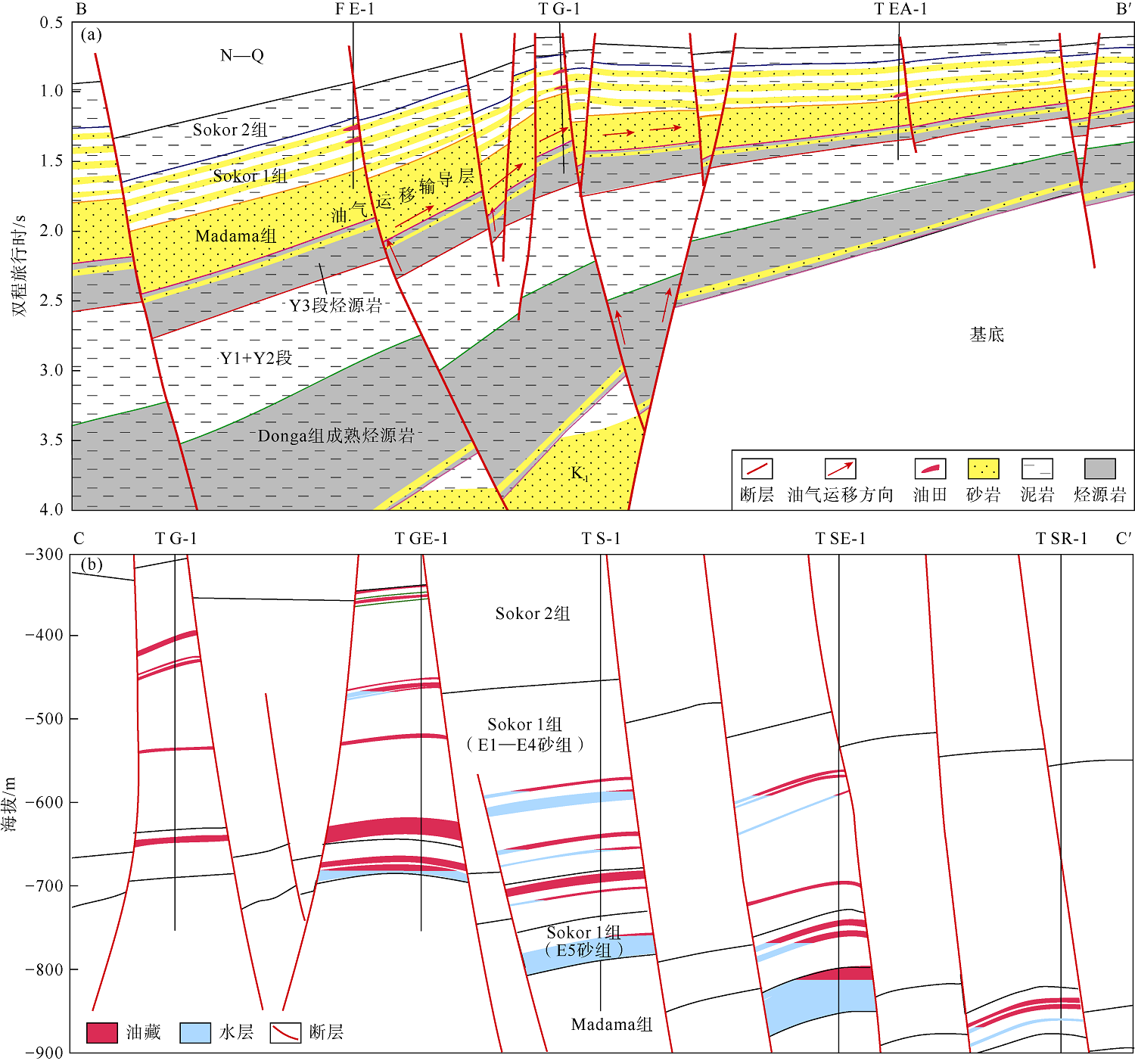 基于地震、钻井、铸体薄片、油样和岩样地球化学分析、生烃史模拟等资料,研究尼日尔Termit海陆相叠合盆地油气成藏特征,并探讨未来油气勘探方向。研究认为:①Termit 盆地为早白垩世和古近纪两期裂谷叠合,东部Trakes 斜坡2 口钻井沉降曲线显示晚白垩世沉降速率高,分析认为是遭受海侵影响造成的高沉积速率,也可能存在一期弱裂谷发育;②Termit盆地沉积层序主要受控于晚白垩世海侵期旋回和古近纪湖侵期旋回控制,发育海-陆“两种源汇”沉积叠合,海侵期广覆式发育的海陆相混源型烃源岩全盆地分布,湖侵期形成的古近系Sokor 1组储集层和Sokor 2组盖层叠置其上,形成了中西非裂谷系独特的海陆相裂谷叠合盆地;③Termit盆地早期地温梯度低,盆地主力烃源岩上白垩统Yogou 组在古近纪晚期生烃。Trakes斜坡发育上白垩统Donga组成熟烃源岩,为“双源”供烃油气成藏模式,形成Trakes斜坡油田群;④Termit盆地海陆相裂谷叠合成藏模式新认识和勘探实践,扩大了盆地东部有效勘探面积约2 500 km2,认为在盆地东南新区带Sokor 1组、新层系Donga组和上白垩统岩性目标具备勘探潜力,可作为未来勘探和选区重点。