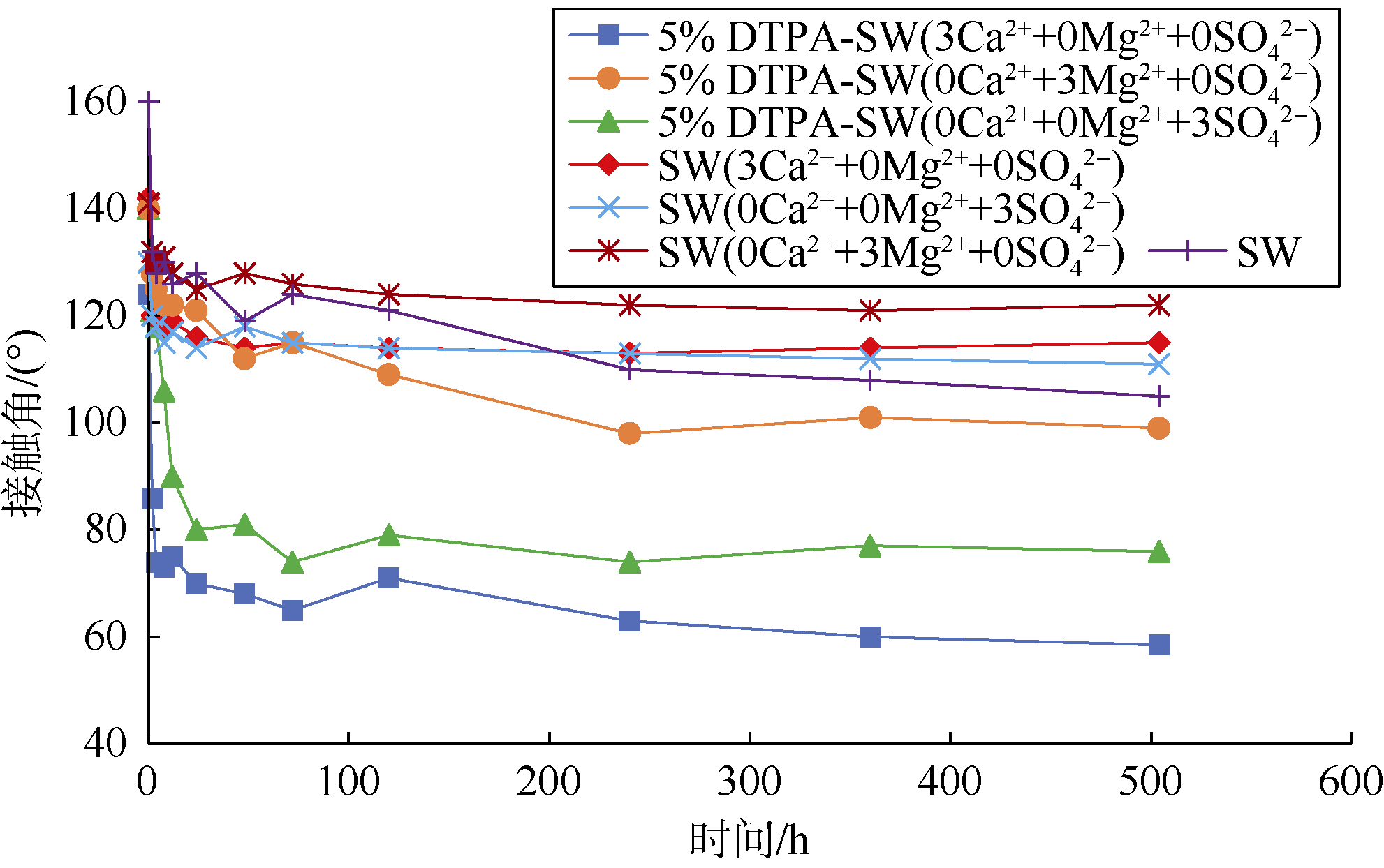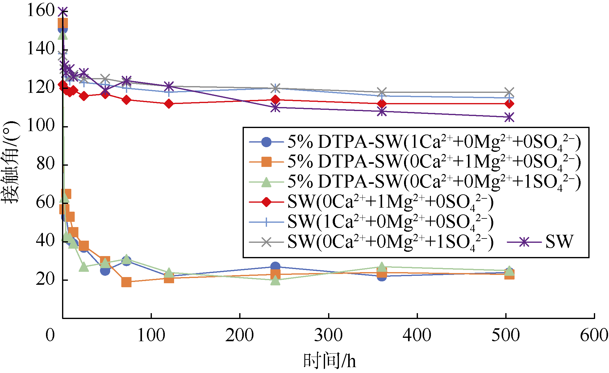 注:SW代表海水,LSW代表低矿化度水,括号里的数字是海水中相应离子浓度的倍数 |
