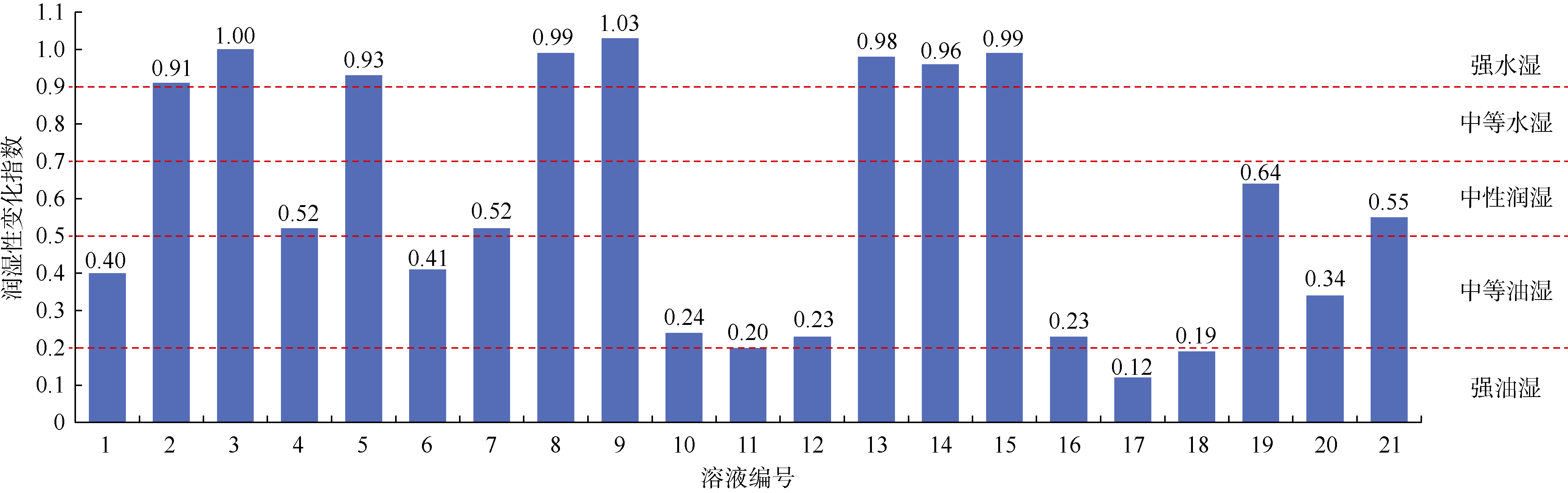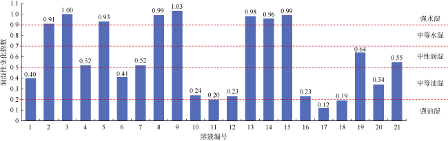 表4 不同溶液的润湿性变化指数 |