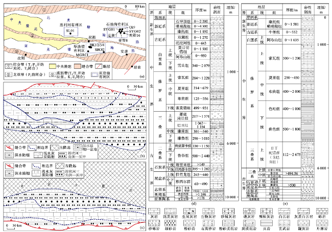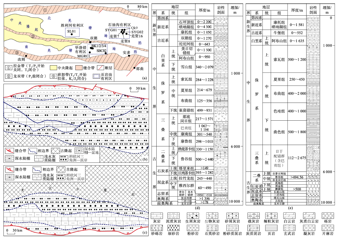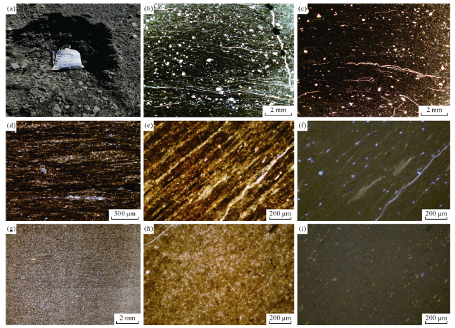 图2 羌塘盆地三叠系巴贡组、侏罗系曲色组泥页岩沉积结构特征(a)石油沟露头剖面,巴贡组深灰色纹层状页岩,露头照片;(b)SYG02井,巴贡组含生屑纹层状钙质页岩,普通薄片;(c)SYG01井,12.1 m,巴贡组含生屑块状泥岩,普通薄片;(d)BK1井,33 m,曲色组纹层状钙质页岩,层理缝发育,普通薄片照片;(e)BK2井,33.2 m,曲色组纹层状钙质页岩,荧光薄片单偏光照片;(f)与样品(e)同视域,原油呈弥漫状、条带状分布,发暗褐黄色、黄褐色或淡黄色荧光,荧光薄片;(g)BK2井,23.5 m,曲色组块状钙质泥岩;(h)BK2井,9.2 m,曲色组块状钙质泥岩,荧光薄片单偏光照片;(i)与样品(h)同视域,原油呈分散状分布,发暗褐黄色、黄褐色、淡黄色荧光,荧光薄片 |