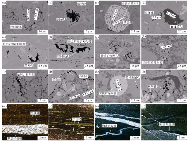 图3 羌塘盆地侏罗系曲色组、三叠系巴贡组泥页岩储集空间类型(a)石油沟地区SYG01井,12.1 m,巴贡组,钙质页岩中粒间孔;(b)样品同(a),溶蚀微孔与构造微缝;(c)石油沟地区SYG02井,43 m,巴贡组,钙质页岩中黄铁矿晶间孔;(d)石油沟地区鄂尔托隆巴剖面,巴贡组,粉砂质泥页岩中有机质孔;(e)毕洛错地区索布查剖面,曲色组,钙质页岩中晶间孔与黏土矿物层间缝;(f)毕洛错地区木苟日王剖面,曲色组,钙质泥页岩中粒间孔、黏土矿物层间缝;(g)毕洛错地区BK1井,11.9 m,钙质页岩,黄铁矿铸模孔;(h)样品同(g),石膏层片晶间孔;(i)胜利河剖面,曲色组,钙质页岩中晶间孔、粒间孔;(j)胜利河剖面,钙质页岩中晶间孔与微裂缝;(k)胜利河SL01井,9.5 m,钙质页岩,黄铁矿晶间孔发育;(l)样品同(k),粒间孔发育;(m)毕洛错地区BK4井,22 m,曲色组,钙质页岩层理缝与顺层构造缝;(n)毕洛错地区BK1井,11.9 m,曲色组,钙质页岩层理缝;(o)毕洛错地区SBC02井,32.3 m,曲色组,钙质泥页岩网状张裂缝,被充填;(p)石油沟地区SYG02井,60 m,巴贡组,钙质泥页岩网状张裂缝 |