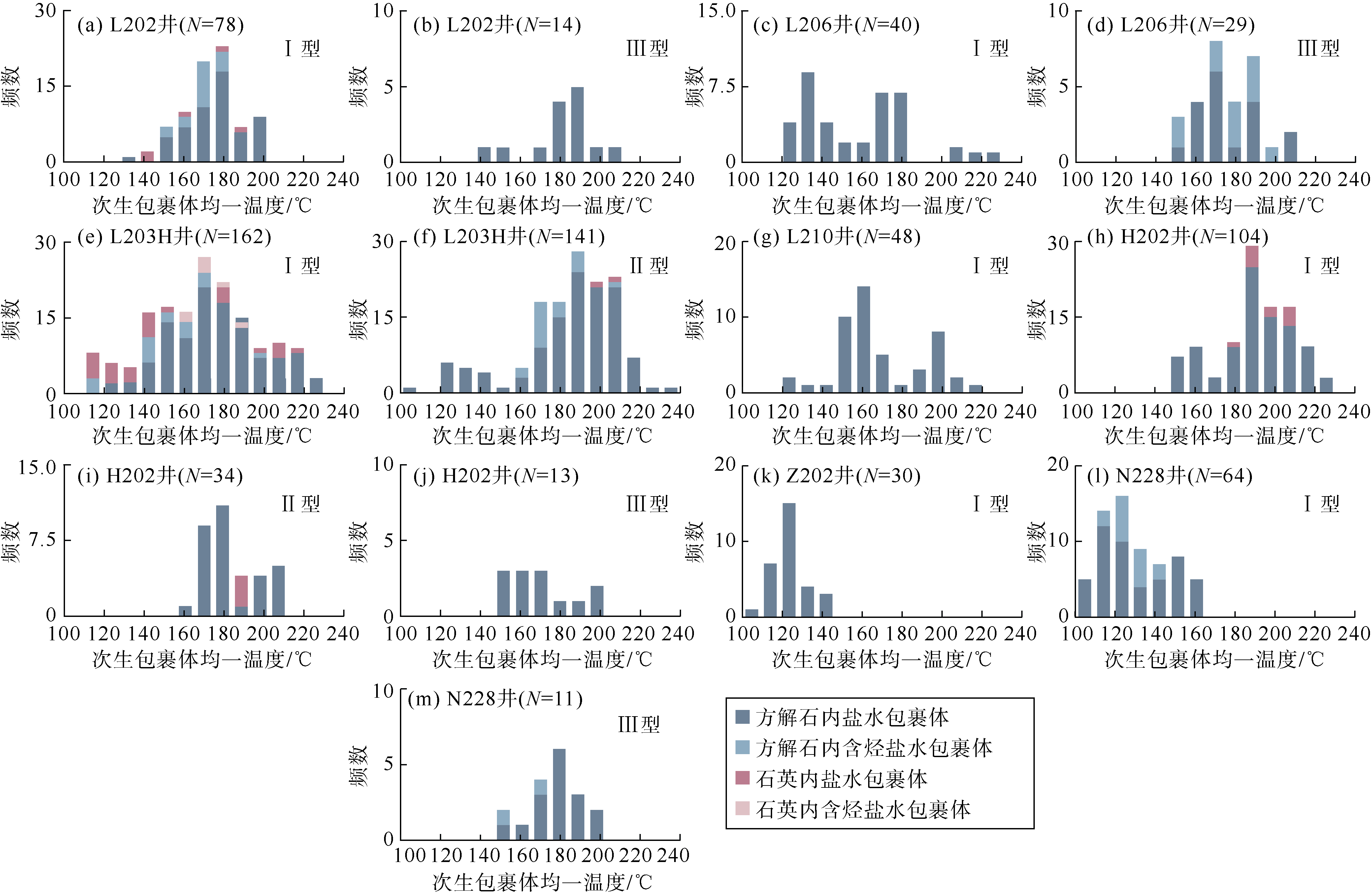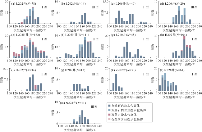 | 井号 | 与气共生的盐水包裹体均一温度/℃ | 拉曼散射峰/ cm−1 | 最早捕获 时间/Ma | 最小捕获 压力/MPa | 压力 系数 |