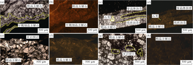 图3 川南深层五峰组—龙马溪组方解石脉矿物岩石学特征(a)Z202井,3 884.76 m,龙马溪组,Ⅰ型脉体,单偏光,边缘发育细晶方解石,向中心发育粗晶方解石;(b)Z202井,3 884.76 m,龙马溪组,Ⅰ型脉体,细晶方解石发亮橘色阴极光,粗晶方解石发暗橘色阴极光;(c)L202井,4 288.83 m,Ⅰ型脉体,单偏光,石英溶蚀交代方解石,晶体表面和边缘发育残余沥青质;(d)L202井,4 288.83 m,龙马溪组,Ⅰ型脉体,石英颗粒发暗棕色阴极光;(e)L203H井,3 755.10 m,五峰组,Ⅱ型脉体,单偏光,发育粗晶方解石;(f)L203H井,3 755.10 m,五峰组,Ⅱ型脉体,粗晶方解石发暗橘色阴极光;(g)L206井,4 038.72 m,龙马溪组,Ⅲ型脉体,单偏光,粗晶方解石内混入页岩碎片;(h)L206井,4 038.72 m,龙马溪组,Ⅲ型脉体,粗晶方解石发暗橘色阴极光 |