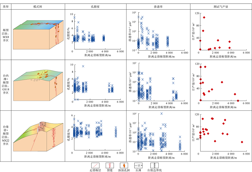 The strike-slip faults and reservoirs in deep Sinian strata in the Anyue gas field of the Sichuan Basin were analyzed to identify the main controlling factors of dolomite reservoirs along the strike-slip fault zone and clarify how the strike-slip faults control the development and distribution of high-quality “sweet spot” (fractured-vuggy) reservoirs. The carbonate matrix reservoirs of the Sinian Dengying Formation are tight, with low porosity (less than 4%) and low permeability (less than 0.5×10-3 μm2). However, the strike-slip faults and their dissolution processes increased the permeability of carbonate rock by more than 1 order of magnitude and allowed the faulting-related dissolution porosity to be more than doubled. The “sweet spot” fractured-vuggy reservoirs controlled by strike-slip faults occurred widely along the strike-slip fault zone. These reservoirs were formed at the end of the Sinian under the joint control of sedimentary microfacies, faulting and karstification. At the platform margin, the control of karstification is predominant; while high-quality reservoirs controlled by both faulting and karstification are developed with the platform, and they are different in areas, types and zones. The structures of the strike-slip fault zone controlled the differential distribution of the fracture zones and the fault-controlled “sweet spot” reservoirs, and led to wide fracture-vug zones. In conclusion, the strike-slip fault related “sweet spot” reservoirs represent a new type of targets for efficient development of resources in deep ancient carbonates. For these reservoirs, specific development strategies should be made according to the diverse and differential controls of strike-slip faults on the reservoirs.