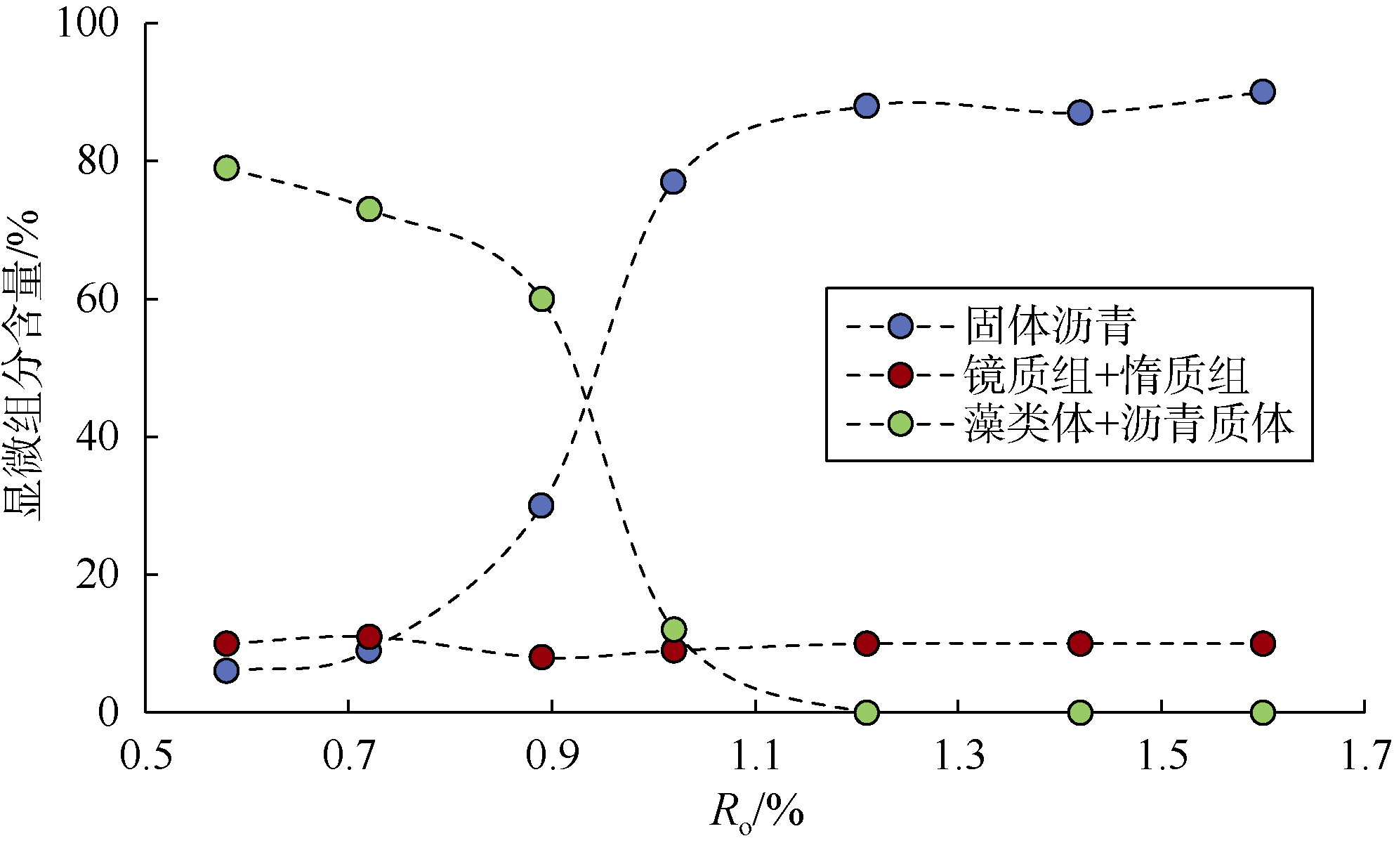 | 热演化阶段 | 固体沥青 | 沥青质体 | 藻类体 | 惰质组 | 镜质组 | ||