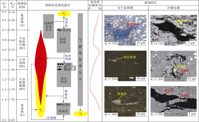 | 后成油固体沥青(Late-oil SB) | 白光下呈灰色(在更致密的孔隙网络中分布),无荧光 | 1.0%<Ro<1.4% | |