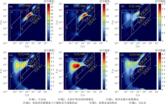 图11 页岩油微运移作用下的二维核磁表征不同赋存状态原油差异(a)样品①:玛页1井,4 910.63 m,P1f1,ΔQ = -915.81 mg/g;(b)样品②:玛页1井,4 911.77 m,P1f1,ΔQ = -1 058.82 mg/g;(c)样品③:玛页1井,4 609.89 m,P1f3,ΔQ = -26.23 mg/g;(d)样品④:玛页1井,4 710.99 m,P1f2,ΔQ =117.56 mg/g;(e)样品⑤:玛页1井,4 594.63 m,P1f3,ΔQ =32.82 mg/g;(f)样品⑥:玛页1井,4 812.58 m,P1f2,ΔQ =48.62 mg/g |
