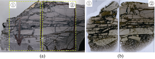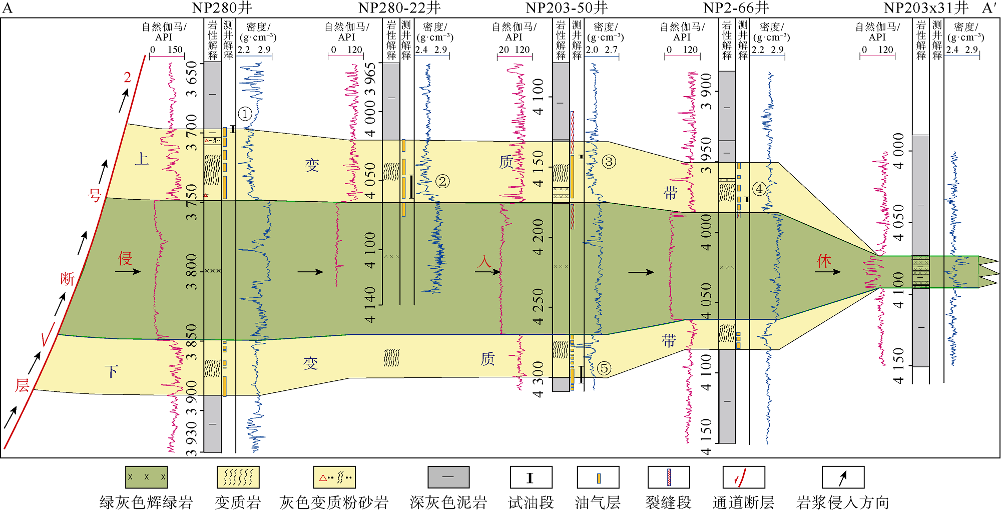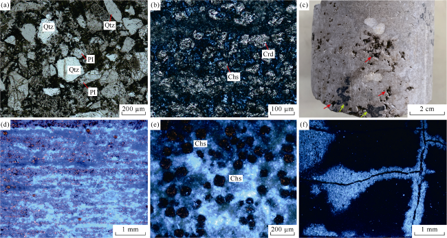 图10 Ⅰ号侵入体上变质带基质孔隙、裂缝和溶蚀孔隙及含油特征(Qtz—石英)(a)NP280-41井,4 176.50 m,上变质带变质细砂岩粒间孔隙被后生的热变质矿物改造,改变了原有的孔隙结构,单偏光100倍;(b)NP203-50井,4 168.58 m,上变质带斑点板岩中孔隙围绕变质矿物分布,铸体薄片单偏光100倍;(c)NP280井,3 853.10 m,红色箭头为变质泥岩中的溶孔(原岩为深灰色,烘烤后为土黄色),绿色箭头为玻璃质小岩脉,岩心照片;(d)NP203-50井,4 168.58 m,变质粉砂岩基质孔隙中的层状含油,亮蓝色为含油荧光,荧光偏光叠合薄片;(e)NP203-50井,4 166.94 m,砂质板岩中的基质孔隙斑状含油,亮蓝色油气围绕深色变质矿物周围分布,荧光偏光叠合薄片;(f)NP203-50井,4 173.25 m,裂缝含油和沿裂缝向基质浸染含油特征,蓝色为含油荧光,荧光偏光叠合薄片 |