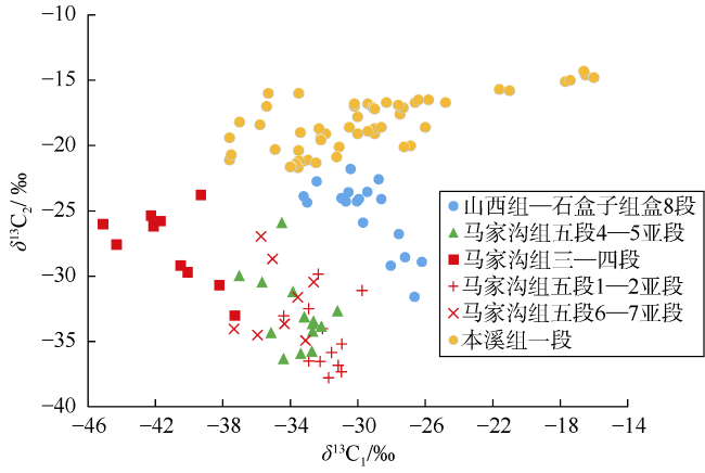 | 煤层气 | 4~8 | 约60 | 变化较大 | 8~12 | 游离气含量低 | 相对较低 | δ13C1偏轻:−70.50‰~−36.19‰[14] | 排采时间较长,单峰曲线[6] | 一般小于 2 500 | |||||||||||||