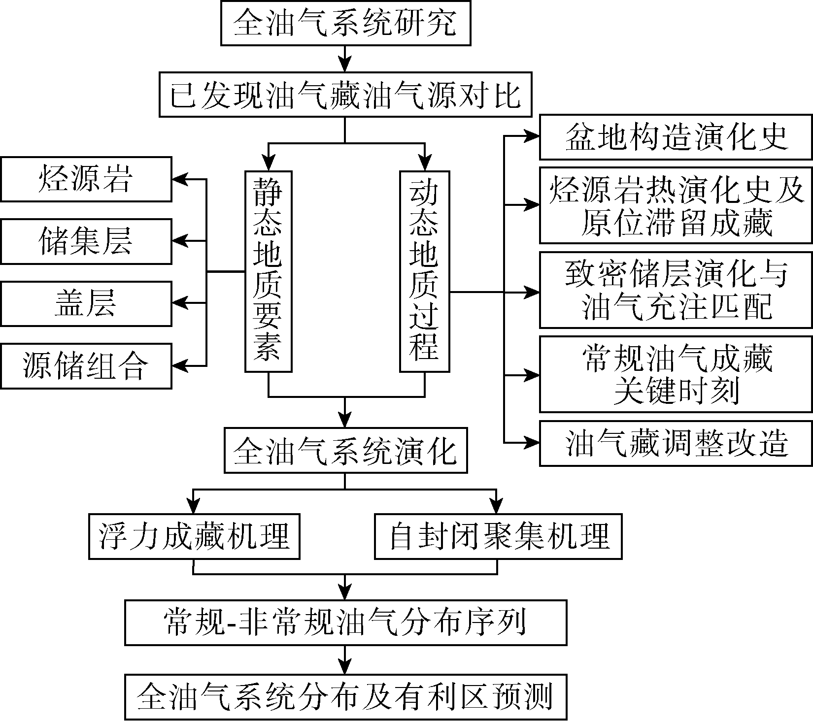 传统的含油气系统理论强调从“源”到“圈闭”的成藏过程恢复,其概念中的油气资源主体为常规油气资源,难以涵盖非常规油气富集机理的理念和研究。全油气系统理论是从含油气系统理论发展而来,结合页岩油气等非常规油气勘探实践与发现,增加了非常规油气的研究内容。尽管全油气系统研究仍涵盖“地质要素、动态演化、油气分布”三大方面,但其研究思路和研究内容相较含油气系统有很大的不同,主要包括:①地质要素方面,含油气系统主要研究烃源岩特征及生烃演化、常规油气储层物性、圈闭、运移和保存条件等内容,而全油气系统在上述研究的基础上增加了滞留烃定量评价、非常规储层表征、源储配置等研究内容;②动态演化方面,含油气系统主要研究常规油气烃源岩演化与圈闭形成期匹配,而全油气系统增加了非常规储层致密化与油气充注的匹配、非常规油气藏后期改造等研究内容;③油气分布方面,含油气系统以浮力成藏机制为核心研究常规油气的运聚与分布,而全油气系统则通过深入理解非常规油气自封闭成藏机制、查明常规—非常规油气分布序列,从而确定全油气系统的油气分布特征。