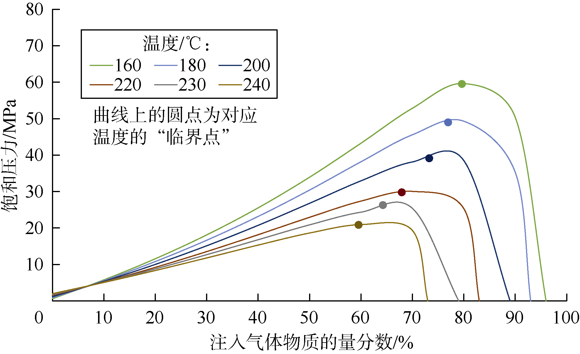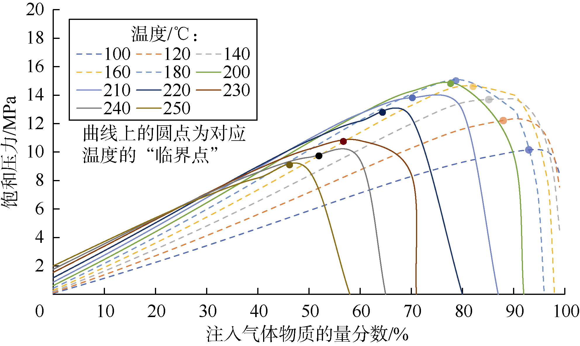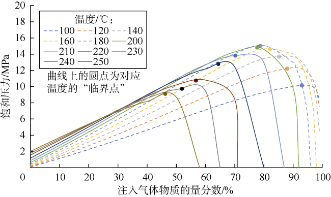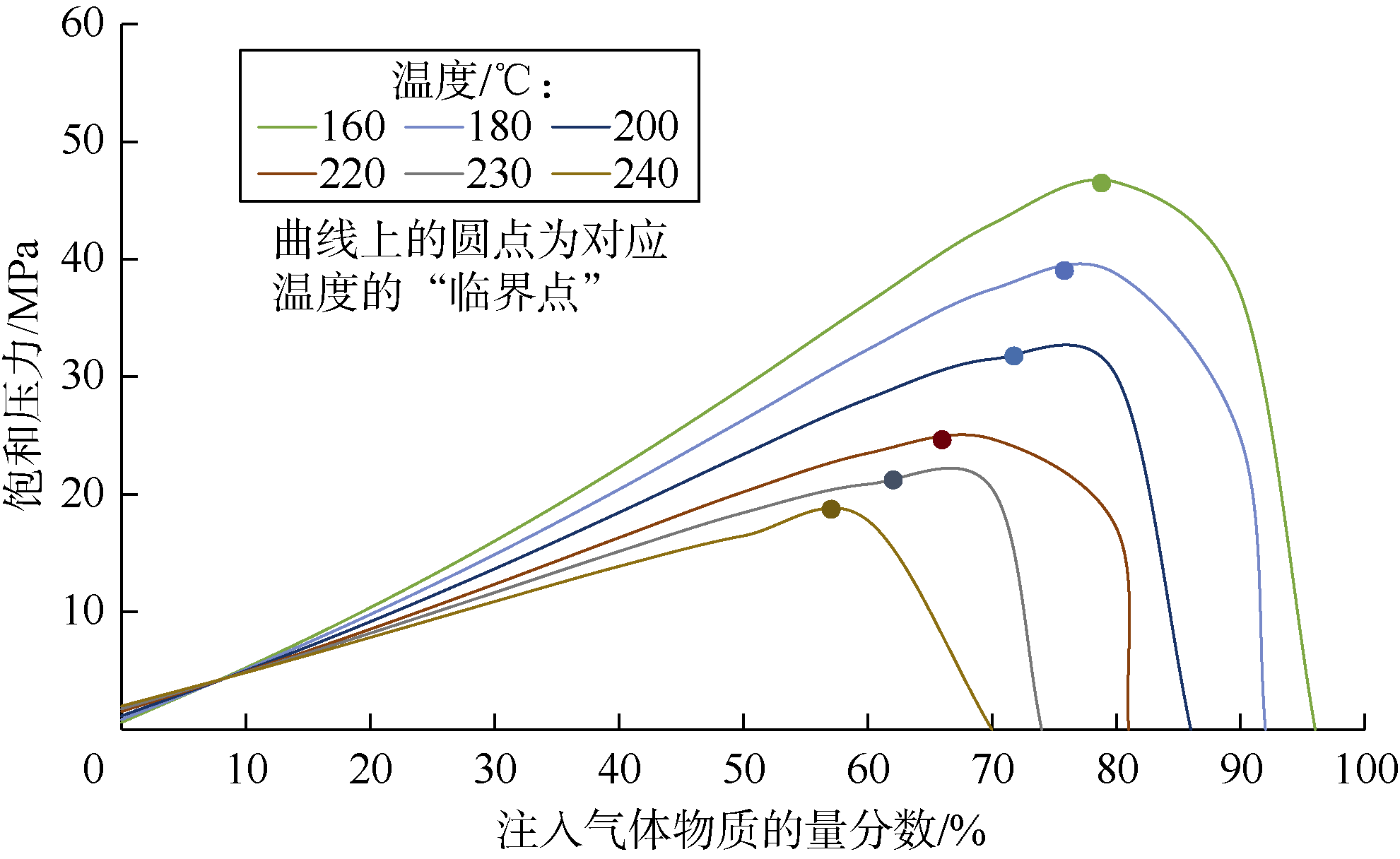 图2),因此油-气系统处于混相状态。在同一压力下,低温区间内(100~200 ℃),当温度升至140 ℃后CO
