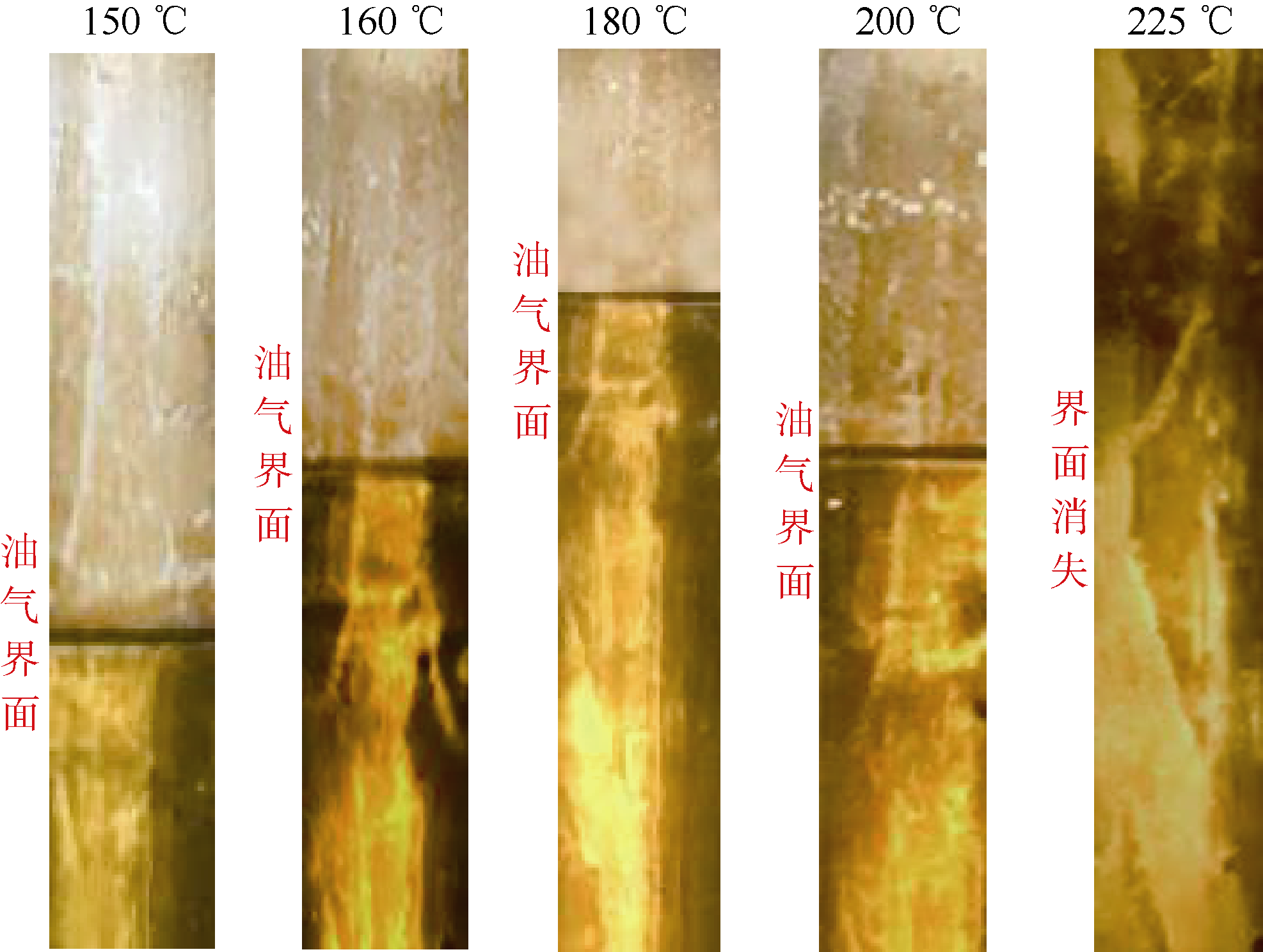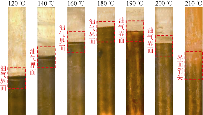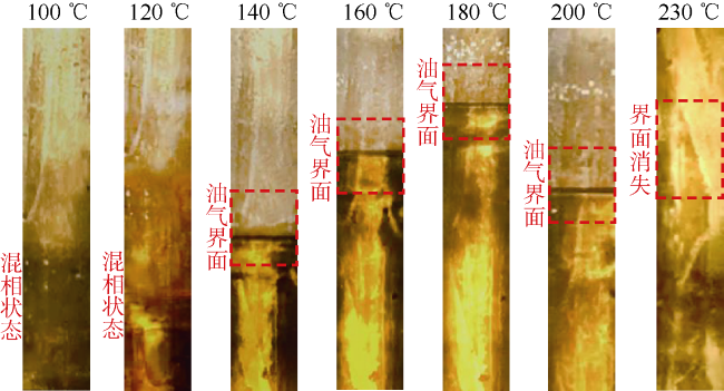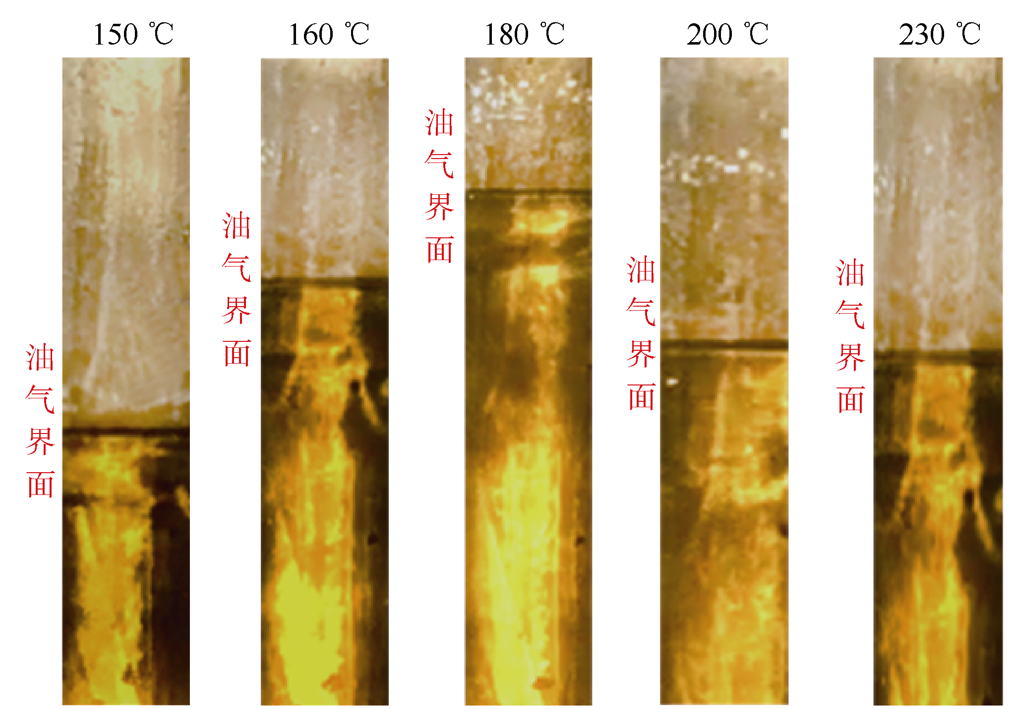 2-原油不再混相,可以定义140 ℃为低温区间的最高混相温度,温度继续升高不利于混相;当温度升高至200 ℃,原油轻组分蒸馏挥发作用起主导作用,加热升温则具有促混作用;温度进一步升高到230 ℃时,CO