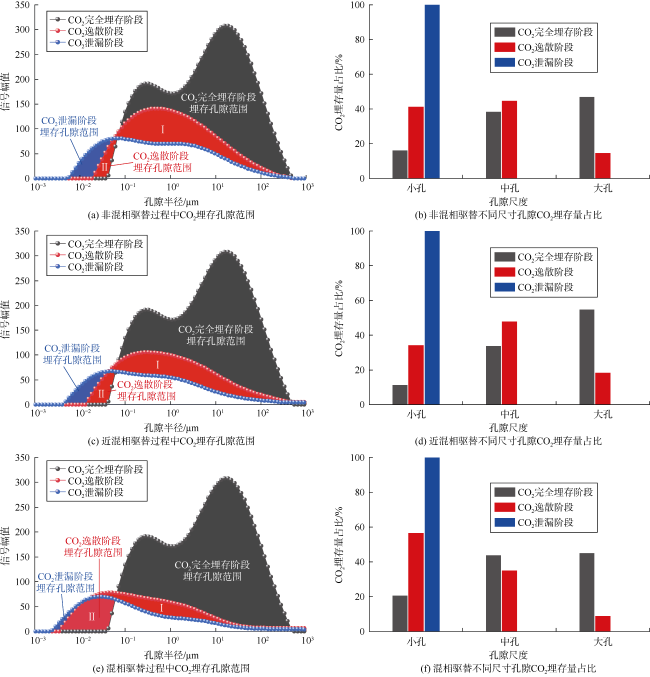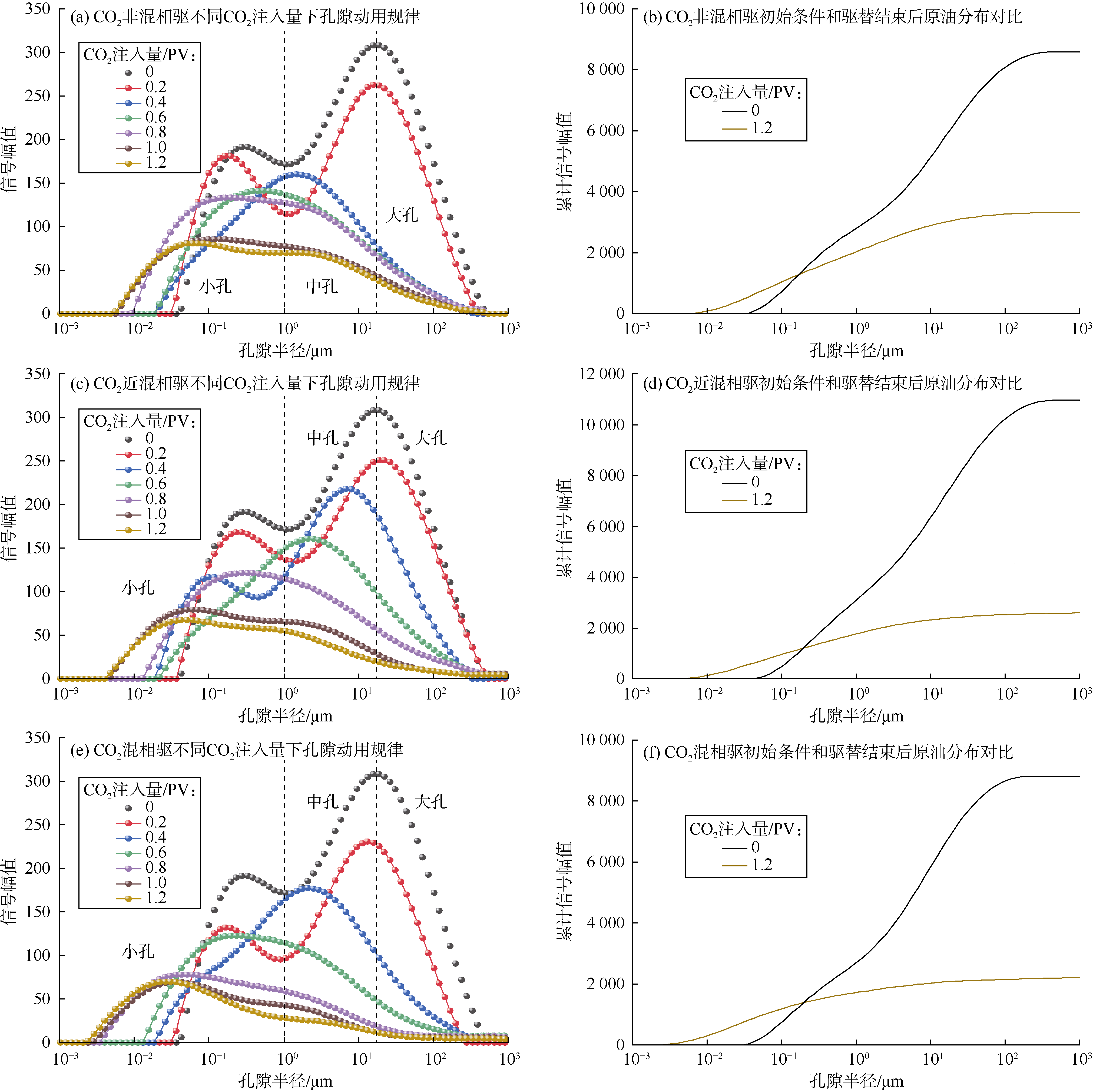 Using the ultra-low permeability reservoirs in the L block of the Jiangsu oilfield as an example, a series of experiments, including slim tube displacement experiments of CO2-oil system, injection capacity experiments, and high-temperature, high-pressure online nuclear magnetic resonance displacement experiments, are conducted to reveal the oil/gas mass transfer pattern and oil production mechanisms during CO2 flooding in ultra-low permeability reservoirs. The impacts of CO2 storage pore range and miscibility on oil production and CO2 storage characteristics during CO2 flooding are clarified. The CO2 flooding process is divided into three stages: oil displacement stage by CO2, CO2 breakthrough stage, CO2 extraction stage. Crude oil expansion and viscosity reduction are the main mechanisms for improving recovery in the CO2 displacement stage. After CO2 breakthrough, the extraction of light components from the crude oil further enhances oil recovery. During CO2 flooding, the contribution of crude oil in large pores to the enhanced recovery exceeds 46%, while crude oil in medium pores serves as a reserve for incremental recovery. After CO2 breakthrough, a small portion of the crude oil is extracted and carried into nano-scale pores by CO2, becoming residual oil that is hard to recover. As the miscibility increases, the CO2 front moves more stably and sweeps a larger area, leading to increased CO2 storage range and volume. The CO2 full-storage stage contributes the most to the overall CO2 storage volume. In the CO2 escape stage, the storage mechanism involves partial in-situ storage of crude oil within the initial pore range and the CO2 carrying crude oil into smaller pores to increase the volume of stored CO2. In the CO2 leakage stage, as crude oil is produced, a significant amount of CO2 leaks out, causing a sharp decline in the storage efficiency.