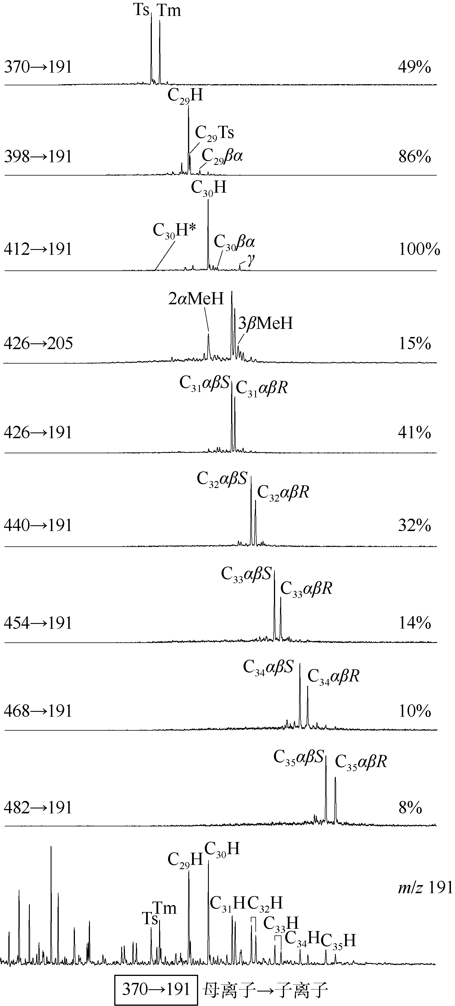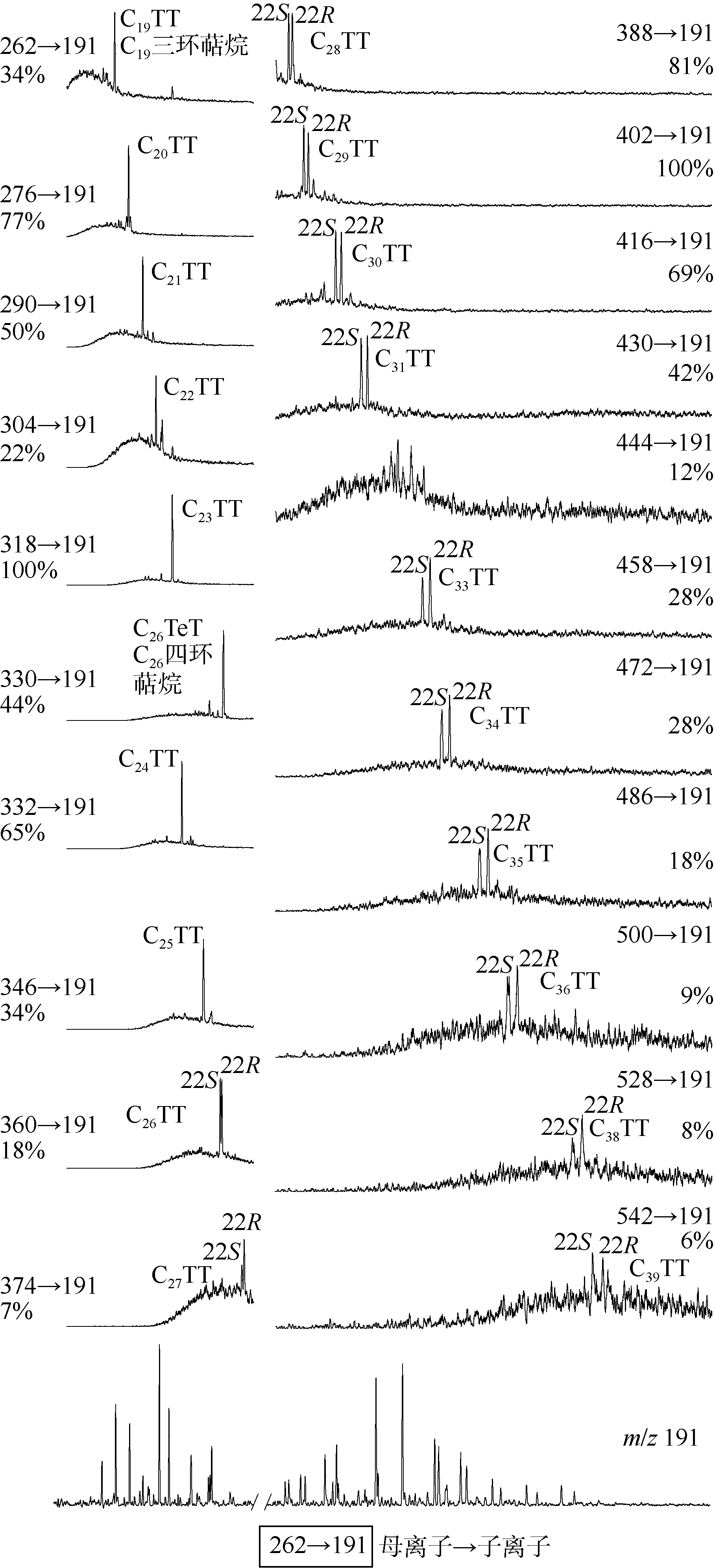 [39⇓-41]。虽然三环萜烷的生物起源尚不十分明确,但是不同类型有机相形成的三环萜烷分布样式却有明显差异,碳酸盐岩烃源岩中通常具有高的C