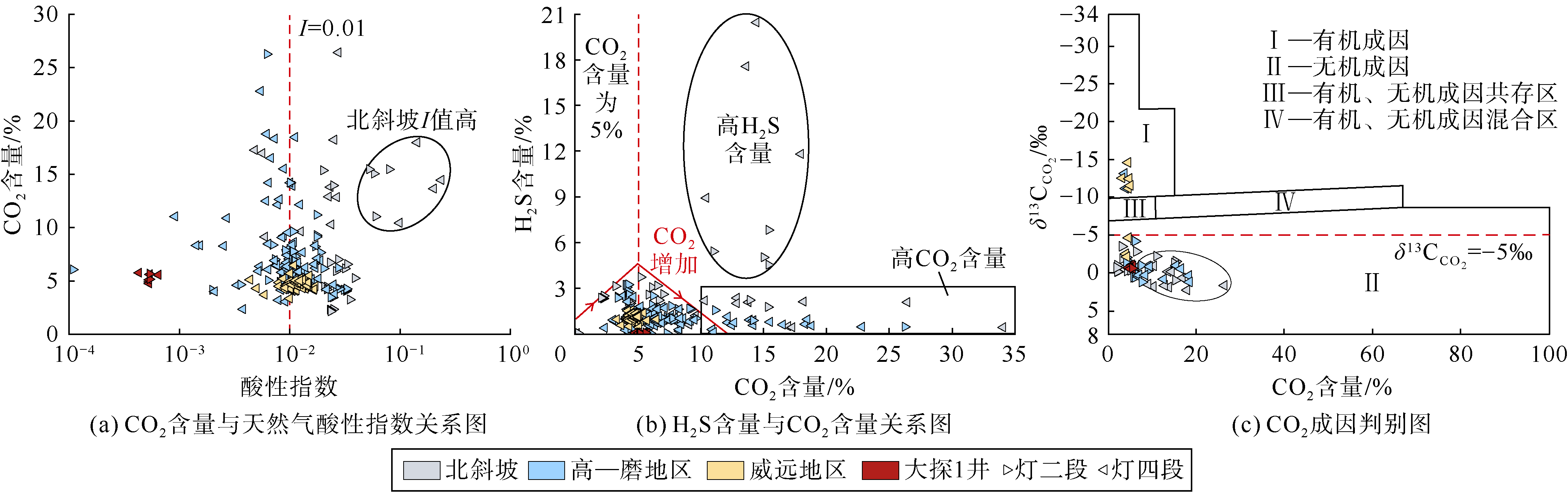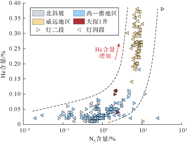 | 区域位置 | 研究区 | 样本数 | CH4含量/% | C2H6含量/% | N2含量/% | He含量/% | CO2含量/% | H2S含量/% | H2含量/% | 干燥系数 |