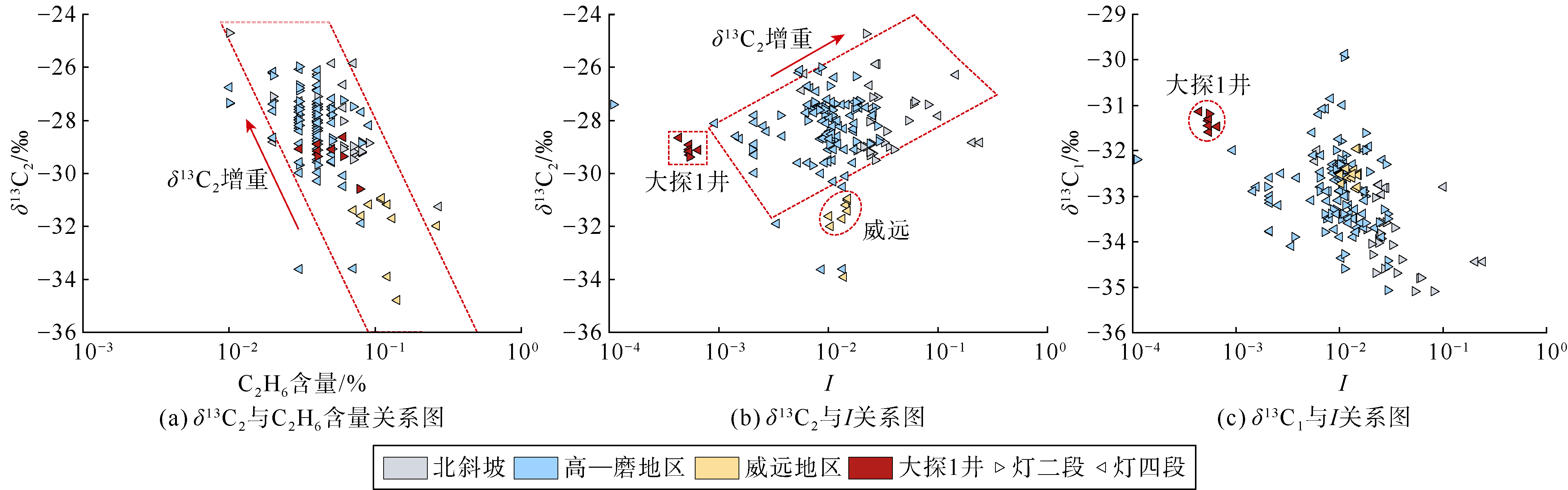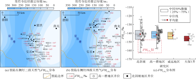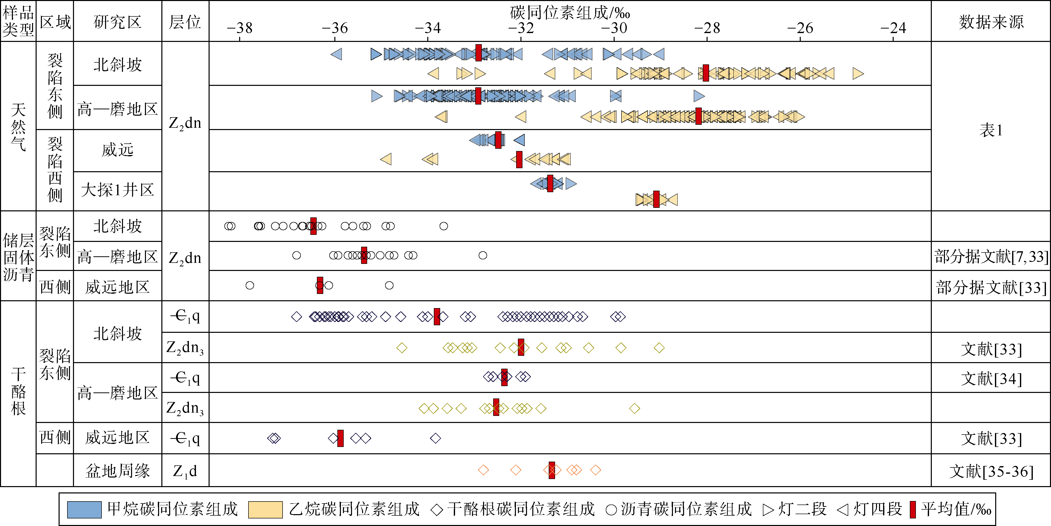 | 区域位置 | 研究 区 | 井号 | 层位 | 深度/m | 天然气组分含量/% | 碳、氢同位素组成/‰ | 数据 来源 | ||||||||||
