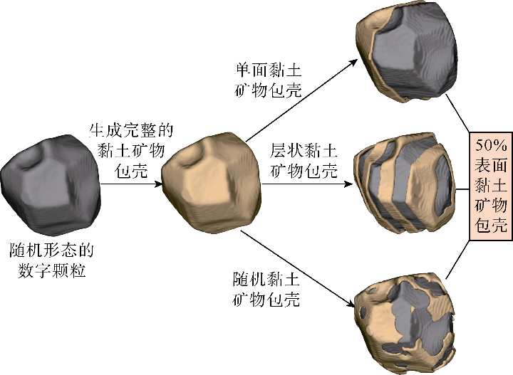 在数字砂岩的颗粒上生成3种不同覆盖率(30%,50%和70%)的随机黏土包壳形态,如