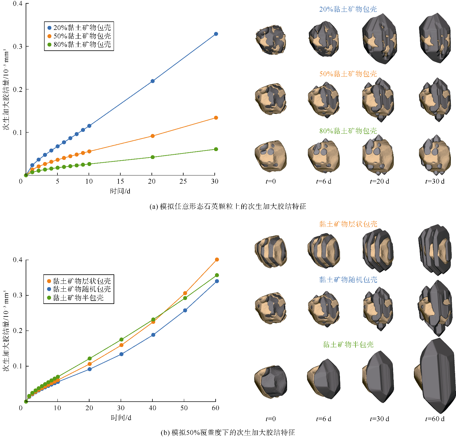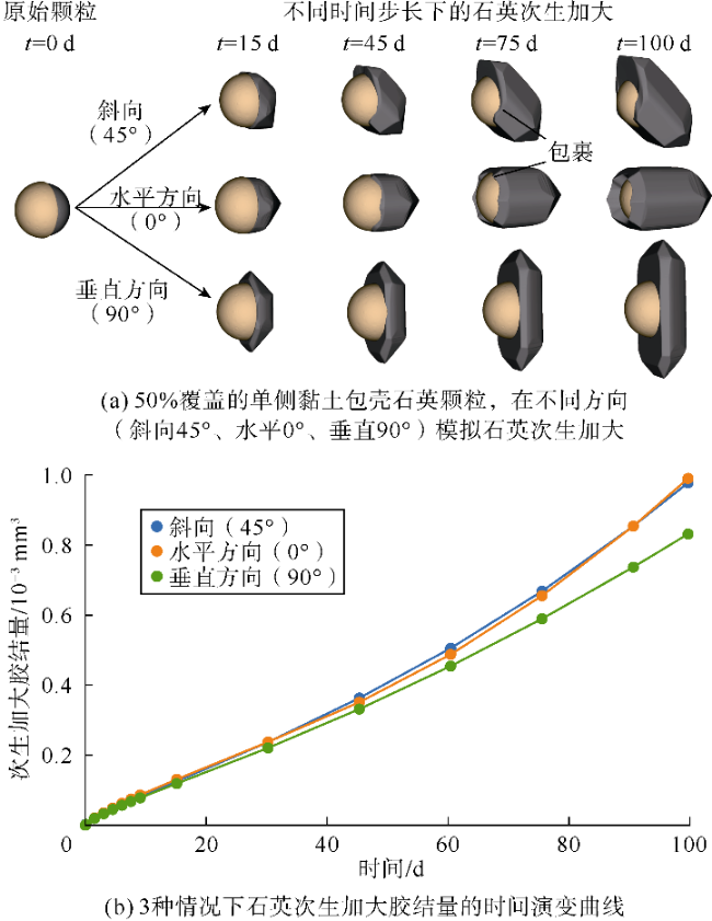 图10b是胶结量和孔隙度随时间的变化曲线,可以看出在包壳覆盖率较低的砂岩中,由于胶结物生长的表面积较大,孔隙度降低得更快。这一点从
