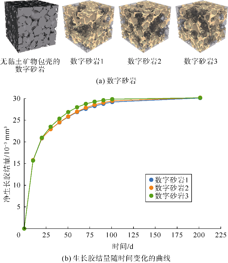 表1所列的模拟参数,模拟3个砂样不同时间阶段的胶结物生长特征(见